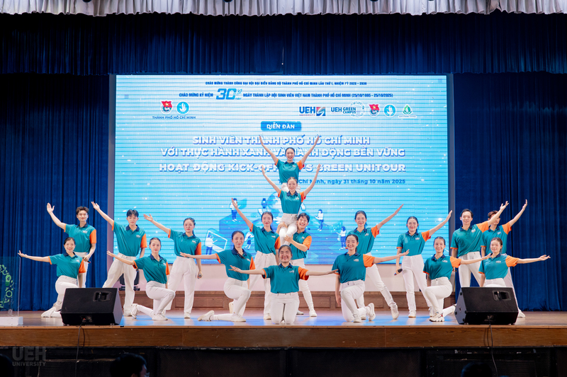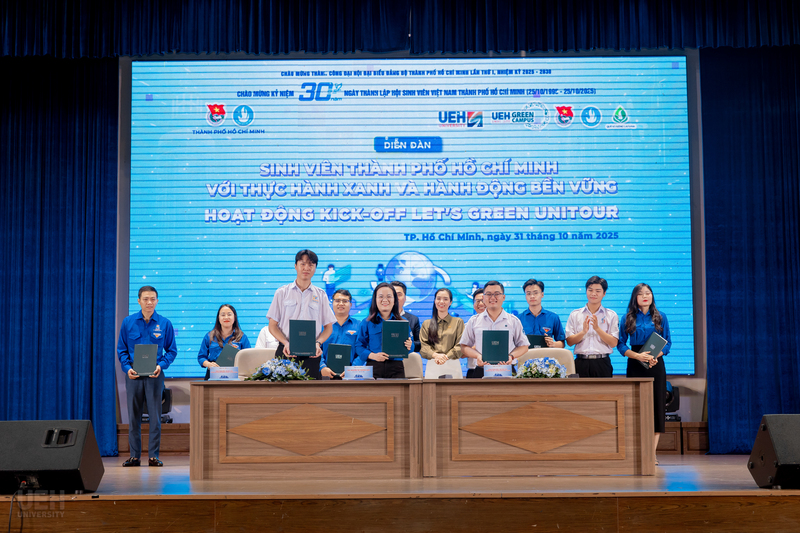On the afternoon of October 31, 2025, in response to the "HCMC Student Week for Pioneering Development in Science, Technology, Innovation, and Digital Transformation 2025," the Ho Chi Minh Communist Youth Union and Vietnamese Students' Association of the University of Economics Ho Chi Minh City (UEH) collaborated with the UEH Green Campus project, with the partnership of VinGroup's Green Future Fund, to successfully organize the "Ho Chi Minh City Students with Green Practices and Sustainable Action" forum. The event also officially launched the Let's Green UniTour Project through a signing ceremony with 10 co-organizing units.