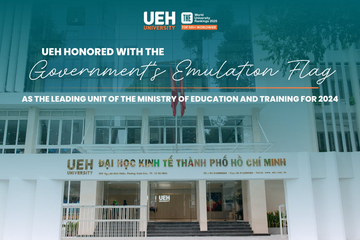 On August 22, 2025, the University of Economics Ho Chi Minh City (UEH) was honored to receive the Government's Emulation Flag, under Decision No. 1802/QD-TTg, for its outstanding completion of tasks and for leading the emulation movement of the Ministry of Education and Training in 2024. This is a prestigious award that recognizes the sustained efforts and remarkable progress of UEH on its journey of innovation, integration, and sustainable development, while also affirming its pioneering position in Vietnam's higher education system.