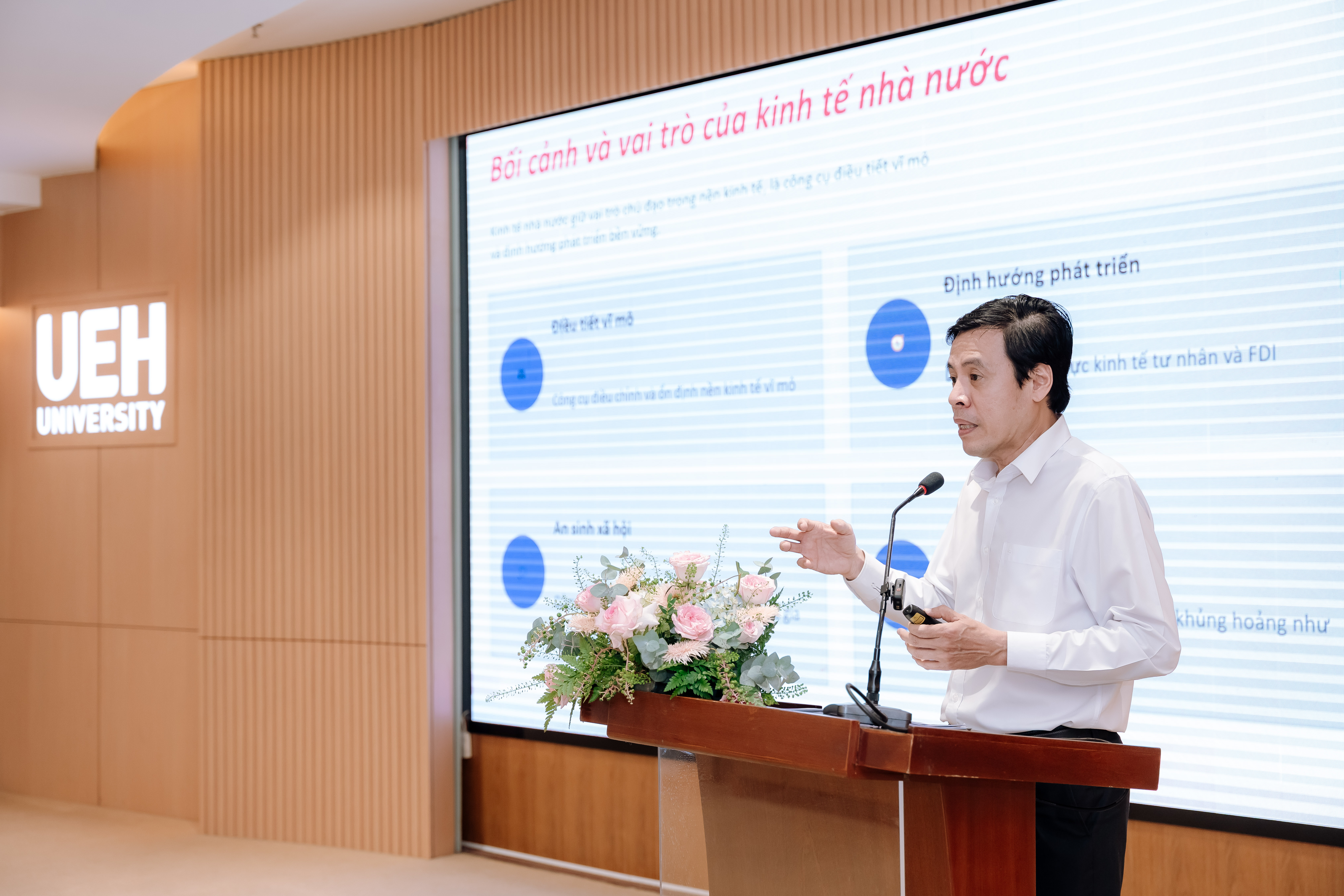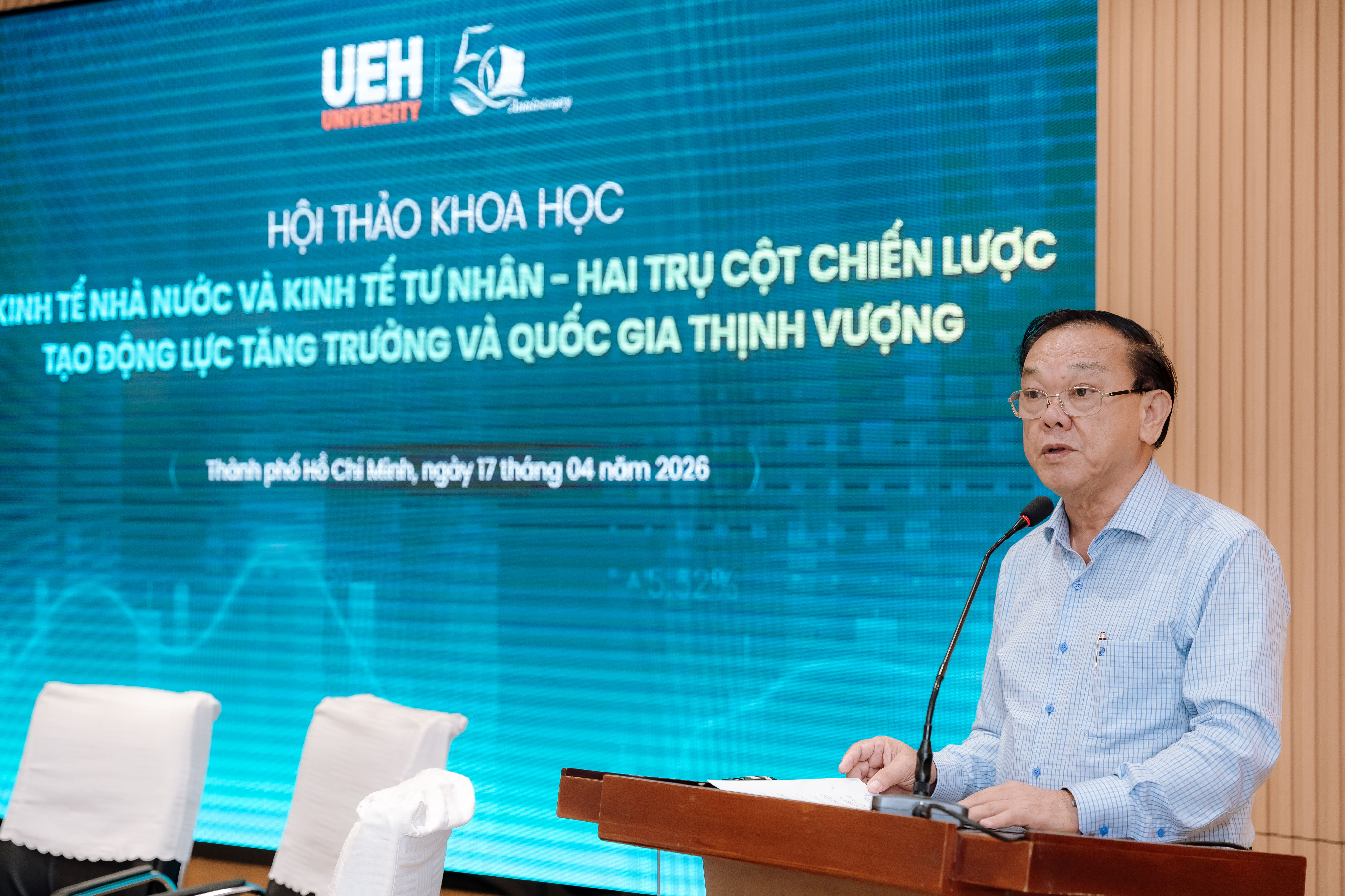 Sáng ngày 17/04/2026, Đại học Kinh tế Thành phố Hồ Chí Minh (UEH) đã tổ chức hội thảo khoa học “Kinh tế nhà nước và kinh tế tư nhân - Hai trụ cột chiến lược tạo động lực tăng trưởng và quốc gia thịnh vượng”, với sự tham gia của lãnh đạo TP.HCM, các chuyên gia, nhà khoa học và đại diện doanh nghiệp. Hội thảo là diễn đàn trao đổi học thuật và thực tiễn, tập trung làm rõ vai trò của hai khu vực kinh tế và thúc đẩy đối thoại về các định hướng chính sách trong giai đoạn phát triển mới.