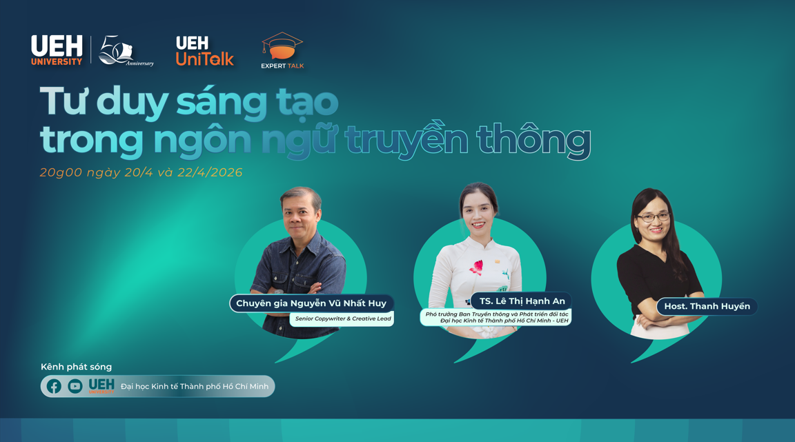 Cùng lắng nghe những giải đáp từ Ông Nguyễn Vũ Nhất Huy – chuyên gia sáng tạo quảng cáo & truyền thông với hơn 25 năm kinh nghiệm và TS. Lê Thị Hạnh An - Phó trưởng Ban Truyền thông và Phát triển đối tác UEH về chủ đề “Tư duy sáng tạo trong ngôn ngữ truyền thông” tại Expert Talk tập 7. Live talk được phát sóng trên hệ thống kênh YouTube UEH Channel: https://go.ueh.edu.vn/ExpertTalk .Với những nội dung hấp dẫn: