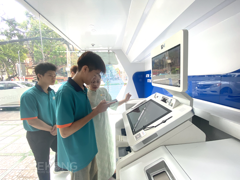 Các bạn sinh viên được trải nhiệm sử dụng máy in thẻ ATM vật lý tại KienLong Bank Cần Thơ