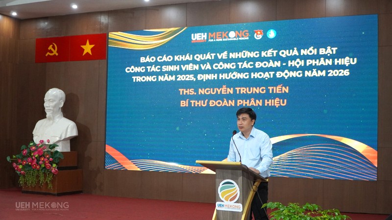 Đồng chí Nguyễn Trung Tiến - Bí thư Đoàn UEH Mekong báo cáo khái quát về những kết quả nổi bật trong công tác sinh viên và công tác Đoàn - Hội năm 2025, phương hướng hoạt động của Đoàn - Hội và công tác sinh viên năm 2026
