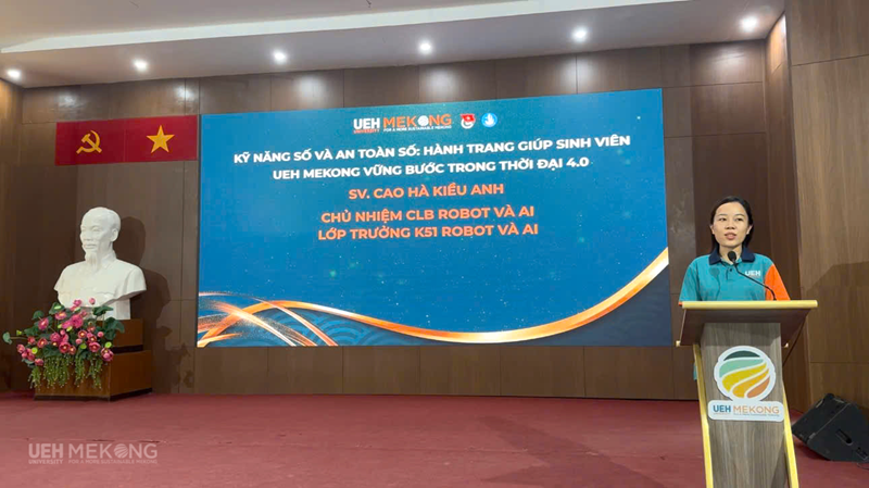 Sinh viên Cao Hà Kiều Anh - Chủ nhiệm CLB Robot và AI, Lớp trưởng K51 Robot và AI trình bày tham luận về “Kỹ năng số và an toàn số: Hành trang giúp sinh viên UEH Mekong vững bước trong thời đại 4.0”