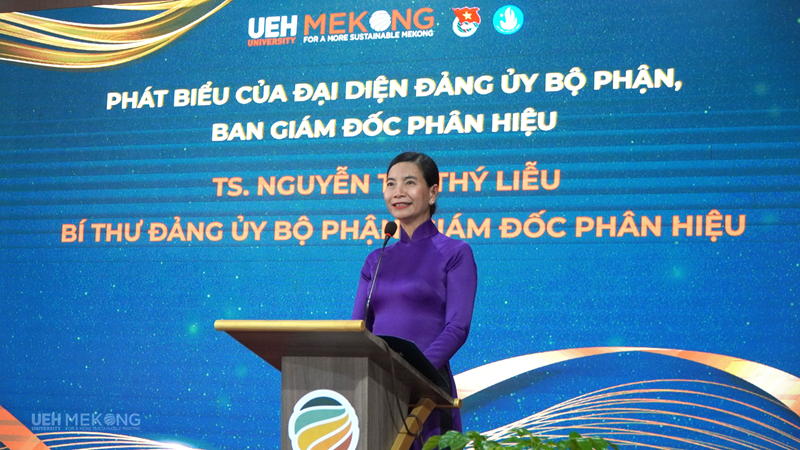 Phát biểu chỉ đạo tại buổi đối thoại, TS. Nguyễn Thị Thý Liễu - Bí thư Đảng ủy, Giám đốc UEH Mekong đánh giá cao tinh thần tích cực đóng góp, cống hiến và xây dựng của các đoàn viên thanh niên, sinh viên UEH Mekong. Cô hy vọng các đoàn viên, sinh viên sẽ tích cực tham gia, đóng góp vào các hoạt động, phong trào của Đoàn - Hội, của các Câu lạc bộ và Chi đoàn lớp mang đến tinh thần lan tỏa hình ảnh năng động của UEH Mekong. Cô cũng nhấn vai trò của sự đồng hành, kết nối giữa Thầy, Cô tại Phân hiệu và đoàn viên, sinh viên cùng tạo xây dựng môi trường học tập năng động, tạo ra những giá trị tích cực cho cộng đồng sinh viên và xã hội. Đặc biệt, Thầy, Cô tại các Phòng, Khoa, Trung tâm luôn đồng hành, hỗ trợ và tạo môi trường, điều kiện thuận lợi để sinh viên học tập, rèn luyện và phát triển toàn diện. Song song đó, mỗi sinh viên cần phát huy tinh thần chủ động, trách nhiệm và quyết tâm trong việc tham gia, đóng góp vào các hoạt động của Phân hiệu cũng như của Đoàn - Hội, qua đó cùng chung tay kiến tạo môi trường học tập tại UEH Mekong ngày càng sáng tạo, năng động và giàu giá trị.