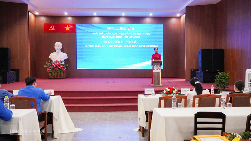 Thay mặt cho Đảng ủy bộ phận phát biểu tại buổi lễ, TS. Nguyễn Thị Thý Liễu - Bí thư Đảng ủy bộ phận, Giám đốc UEH Mekong ghi nhận và biểu dương thành tích cũng như sự nỗ lực, nhiệt quyết, trách nhiệm của các tập thể, Đoàn viên thanh niên, sinh viên UEH Mekong trong suốt thời gian qua. Đặc biệt là những kết quả, thành tích đáng tự hào trong các hoạt động Tháng Thanh niên đã gắn với những giá trị về học thuật, cộng đồng và sự bền vững. Từ những hoạt động phong trào văn hóa, thể thao đến những công trình tình nguyện, hoạt động vì cộng đồng đã tạo nên môi trường không chỉ giúp sinh viên học hỏi mà còn rèn luyện sự trưởng thành, bản lĩnh trong sinh viên. Bên cạnh đó, TS. Nguyễn Thị Thý Liễu bày tỏ kỳ vọng sinh viên UEH Mekong sẽ phát huy tinh thần chủ động, nuôi dưỡng khát vọng vươn lên và xây dựng tư duy học tập suốt đời; không ngừng rèn luyện để tạo ra những giá trị tốt đẹp cho cộng đồng và xã hội. Đồng thời, sinh viên cần đề cao các giá trị cốt lõi về trách nhiệm và sự nghiêm túc trong từng hành động, từ môi trường học tập đến các hoạt động tình nguyện, từ đó góp phần lan tỏa hình ảnh tích cực của sinh viên UEH Mekong.