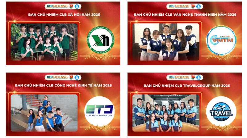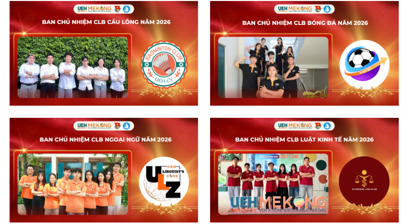 Tương tự các Ban chuyên môn, năm 2026, Đoàn UEH Mekong đã kiện toàn và giới thiệu nhân sự ban chủ nhiệm mới của 18 câu lạc bộ đang hoạt động, gồm: CLB Xã hội, CLB Văn nghệ Thanh niên, CLB Cầu lông, CLB Bóng chuyền, CLB Bóng đá, CLB Bóng rổ, CLB Bóng bàn, CLB Ngoại ngữ, CLB Kinh doanh quốc tế, CLB Luật Kinh tế, CLB Kinh doanh quốc tế, CLB Công nghệ Kinh tế, CLB Kế toán - Thuế, CLB Nghiên cứu Tài chính - Ngân hàng, CLB Nghiên cứu Marketing, CLB Nghiên cứu khoa học Sinh viên, CLB Phát triển nhân lực, CLB Robot và Trí tuệ nhân tạo. Việc kiện toàn và bổ sung đội ngũ Ban chủ nhiệm các CLB không chỉ đảm bảo tính kế thừa mà còn tạo điều kiện cho nhiều nhân tố mới phát huy năng lực, góp phần nâng cao chất lượng tổ chức các hoạt động học thuật và phong trào. Với lực lượng nhân sự được hoàn thiện, các câu lạc bộ hứa hẹn sẽ mang đến nhiều hoạt động thiết thực, sáng tạo, hỗ trợ sinh viên phát triển toàn diện về kiến thức và kỹ năng.