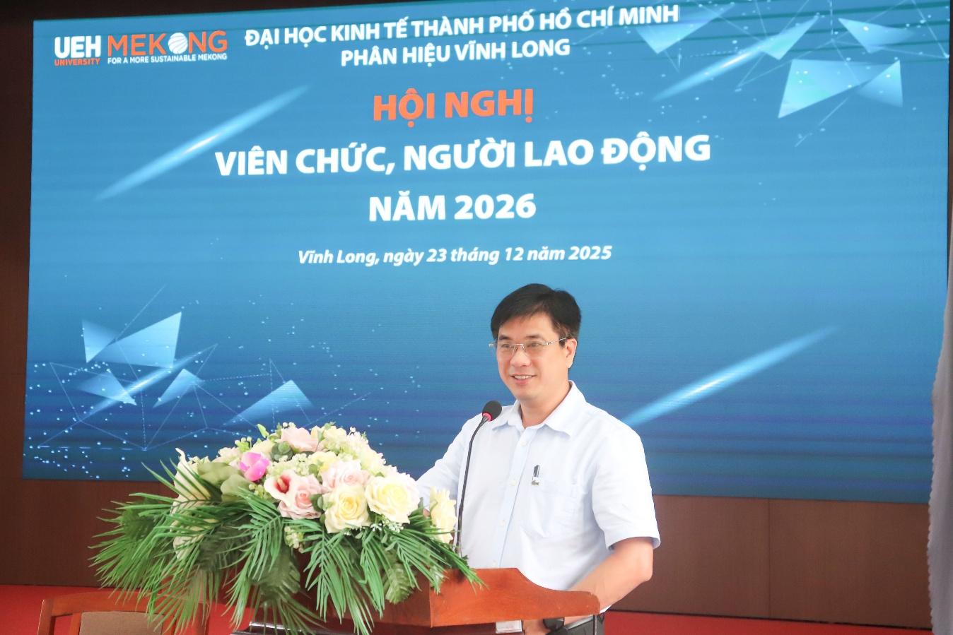 Tiếp nối chương trình, ThS. Hồ Thiện Quyền - Phó Giám đốc UEH Mekong đã trình bày tổng kết ý kiến đóng góp của viên chức, người lao động về các hoạt động trong năm 2025 và lên kế hoạch hoạt động cho các lĩnh vực, phương hướng của Phân hiệu trong năm 2026, dựa trên tinh thần xây dựng, cùng hướng tới mục tiêu vì sự phát triển của UEH Mekong.