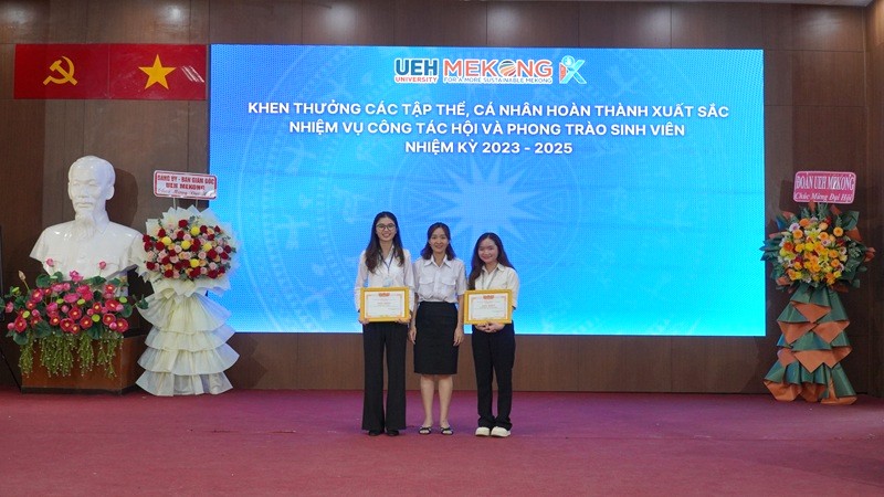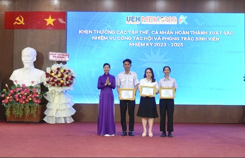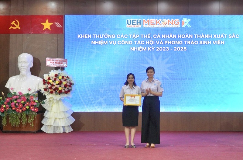 Đồng chí Trần Thị Ngọc Thoại - Ủy viên BTV tỉnh Đoàn, Phó Chủ tịch thường trực Hội Sinh viên Việt Nam tỉnh Vĩnh Long trao Giấy khen của Hội Sinh viên tỉnh cho Tập thể Hội SV UEH Mekong nhiệm kỳ 2023-2025