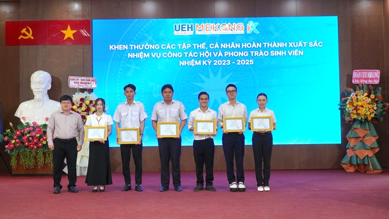ThS. Hồ Thiện Quyền - Đảng ủy viên phụ trách công tác Đoàn - Hội, Phó Giám đốc UEH Mekong trao Giấy khen của Giám đốc Phân hiệu cho các cá nhân sinh viên