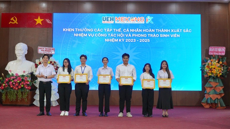 Đồng chí Nguyễn Tự Trung Nhã - Chủ tịch Hội Sinh viên nhiệm kỳ 2025-2028 trao Giấy khen của BCH Hội Sinh viên UEH Mekong cho các cá nhân