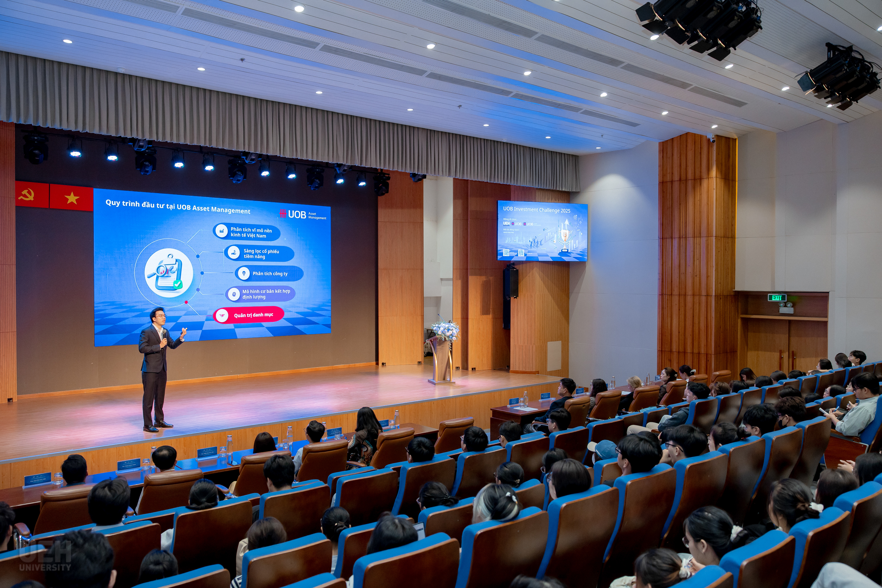 Sáng ngày 13/9/2025, tại Hội trường B1.302, Lễ khai mạc UOB Investment Challenge 2025 đã diễn ra trong không khí sôi nổi với sự tham dự của đại diện Ngân hàng UOB Việt Nam, UOB Asset Management (UOBAM) Việt Nam, Đại học Kinh tế Thành phố Hồ Chí Minh (UEH), và Quý thầy/cô cùng đông đảo sinh viên đến từ các trường đại học/cao đẳng trên địa bàn TP. Hồ Chí Minh.