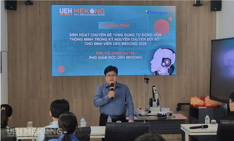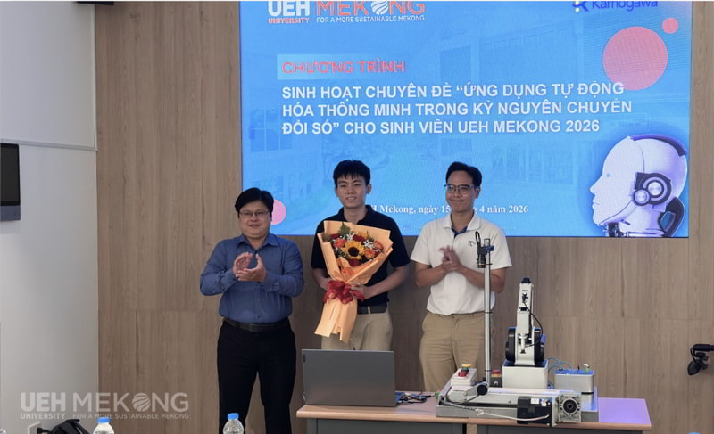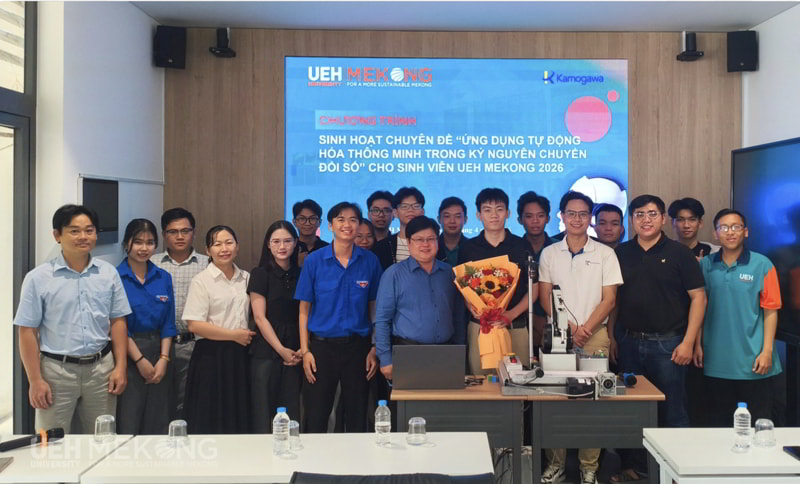 Chiều ngày 15/4/2026, Khoa Công nghệ thuộc UEH Mekong và CLB RoboAI thuộc Đoàn Thanh niên Phân hiệu đã phối hợp cùng Công ty TNHH Kamogawa Việt Nam và Công ty TNHH RoboLinks Việt Nam tổ chức Chương trình sinh hoạt chuyên đề với chủ đề “Ứng dụng Tự động hóa Thông minh trong Kỷ nguyên Chuyển đổi số”. Chương trình được tổ chức nhằm kết nối doanh nghiệp, giúp sinh viên tiếp cận các xu hướng công nghệ mới, qua đó định hướng nghề nghiệp cho sinh viên trong bối cảnh cuộc cách mạng công nghiệp 4.0 đang diễn ra mạnh mẽ.