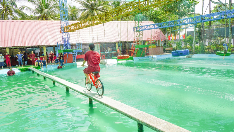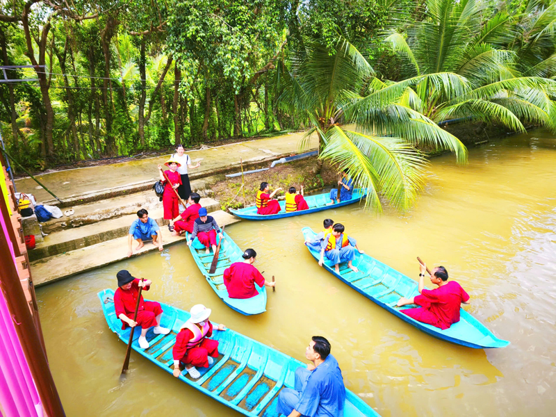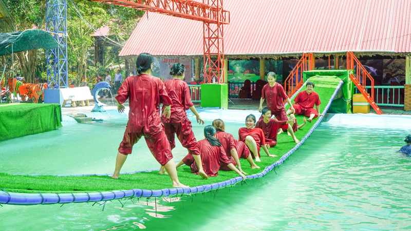 Đoàn mặc trang phục áo bà ba chụp ảnh lưu niệm và tham gia các trò chơi dân gian tại Khu du lịch sinh thái Làng Xanh