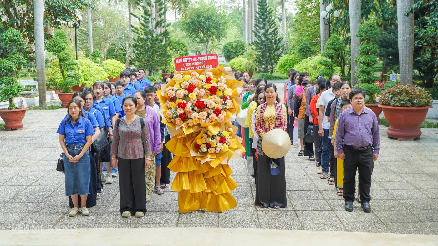 Mở đầu chuỗi hoạt động, ngày 01/3/2026, Công đoàn UEH Mekong phối hợp với chính quyền và Chi đoàn cơ quan tổ chức chuyến về nguồn tại Khu di tích lịch sử, văn hóa cấp quốc gia Đền thờ Chủ tịch Hồ Chí Minh (Phường Trà Vinh, tỉnh Vĩnh Long). Hành trình không chỉ mang đến những trải nghiệm ý nghĩa mà còn góp phần giáo dục truyền thống cách mạng cho đoàn viên; qua đó khơi dậy niềm tự hào dân tộc, lòng yêu nước, nâng cao nhận thức cho đoàn viên về tư tưởng, đạo đức, phong cách Hồ Chí Minh gắn với việc phát huy vai trò, vị thế của phụ nữ trong thời kỳ mới.