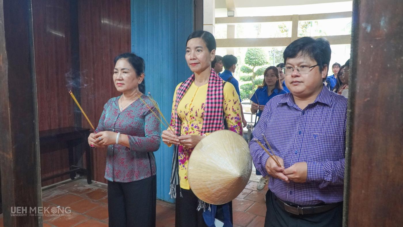 TS. Nguyễn Thị Thý Liễu - Bí thư Đảng ủy bộ phận, Giám đốc UEH Mekong, ThS. Hồ Thiện Quyền - Phó Giám đốc, Chủ tịch Công đoàn cơ sở; Ths Trương Thị Nhi - Phó Bí thư Đảng ủy bộ phận thành kính dâng hương tưởng niệm trước anh linh Chủ tịch Hồ Chí Minh