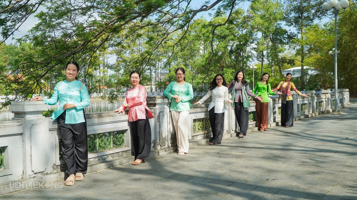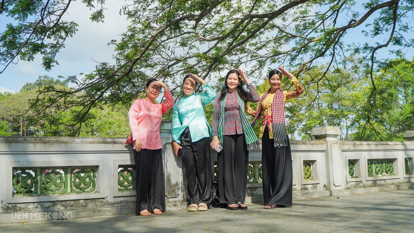 - Ngày 01/3/2026, Nữ VC-NLĐ đã mặc trang phục Áo bà ba tham gia hoạt động về nguồn tại Đền thờ Chủ tịch Hồ Chí Minh và hoạt động tham quan, dã ngoại tại Khu du lịch Huỳnh Kha và Khu di tích danh thắng quốc gia Ao Bà Om. Hình ảnh nữ VC-NLĐ UEH Mekong trong tà áo bà ba giản dị giữa không gian trang nghiêm của khu di tích đã tôn lên vẻ đẹp mộc mạc, gần gũi của người phụ nữ Nam Bộ. Trang phục truyền thống không chỉ thể hiện nét duyên dáng, nền nã mà còn thể hiện sự trân trọng đối với các giá trị văn hóa, góp phần gìn giữ và lan tỏa bản sắc dân tộc.