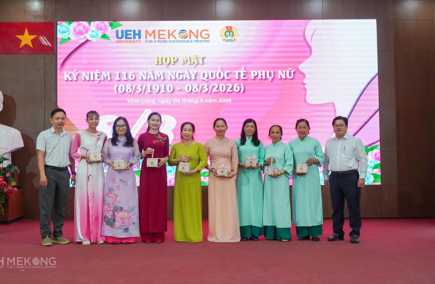 Cùng ngày, Công đoàn cơ sở phối hợp với chính quyền tổ chức buổi họp mặt kỷ niệm 116 năm Ngày Quốc tế Phụ nữ trong không khí ấm áp, trang trọng. Lãnh đạo Phân hiệu ghi nhận và biểu dương những đóng góp tích cực của nữ VC-NLĐ trong giảng dạy, nghiên cứu, quản lý và phục vụ; đồng thời khẳng định vai trò quan trọng của phụ nữ trong chiến lược phát triển lâu dài của UEH Mekong.