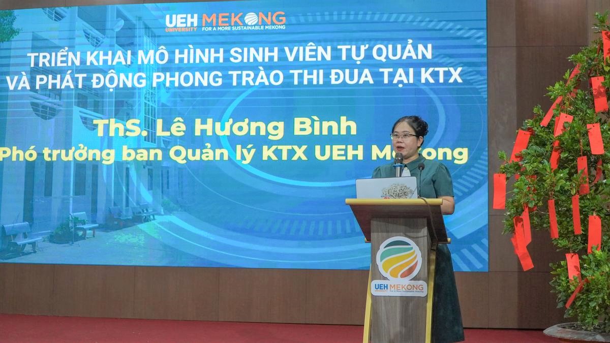 Phát biểu chào mừng tân sinh viên, ThS. Hồ Thiện Quyền - Phó Giám đốc UEH Mekong nhấn mạnh: “Chương trình Chào đón tân sinh viên tại KTX năm nay là chương trình chào đón tân sinh viên lần đầu tiên được tổ chức trong khu nội trú, nhằm tạo điều kiện để sinh viên nội trú giao lưu, gắn kết, chia sẻ kinh nghiệm sống và sinh hoạt trong khu nội trú. Đồng thời, trong Chương trình này, Ban Quản lý Ký túc xá (QLKTX) sẽ triển khai đến các bạn tân sinh viên Mô hình sinh viên tự quản - một mô hình được áp dụng thống nhất từ Ký túc xá Cơ sở chính tới Ký túc xá UEH Mekong và triển khai Kế hoạch các hoạt động phong trào trong KTX năm học 2025-2026. Qua chương trình, Ban Quản lý KTX cũng mong muốn nhận thêm các ý kiến đóng góp từ các sinh viên nội trú để các phong trào tại KTX được đa dạng và phong phú hơn”.