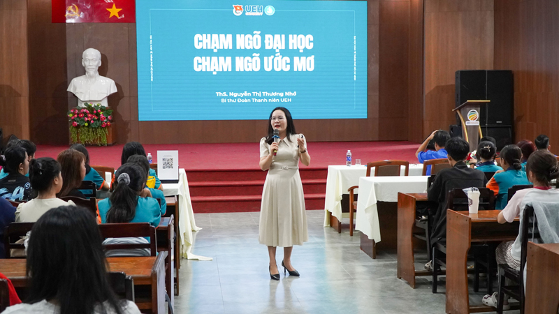 Mở đầu buổi giao lưu, ThS. Nguyễn Thị Thương Nhớ - Bí thư Đoàn thanh niên UEH đã chia sẻ với các bạn sinh viên về việc chuẩn bị cho hành trình “Chạm ngõ đại học - Chạm ngõ ước mơ" ngay từ hôm nay và những điều các bạn chuẩn bị hành trình viết tiếp ước mơ của mình cũng như có thể giải tỏa được góc cảm xúc tân sinh viên khi mới xa nhà, xa quê hương, dễ dàng thích nghi với môi trường mới cũng như giúp các bạn chuẩn bị tâm lý vượt qua áp lực thi cử và áp lực đồng trang lứa.