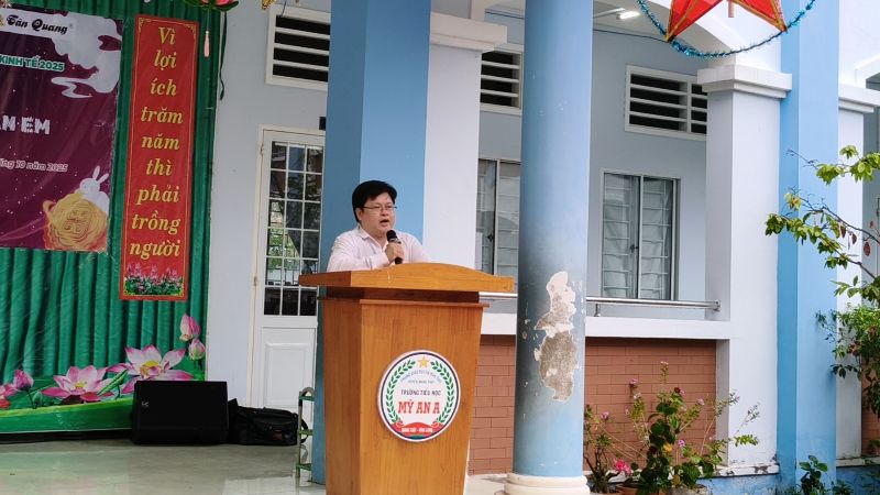 ThS. Hồ Thiện Quyền - Đảng ủy viên phụ trách công tác Đoàn thanh niên, Phó Giám đốc UEH Mekong phát biểu tại Chương trình “Vui hội trăng rằm” ở xã Nhơn Phú