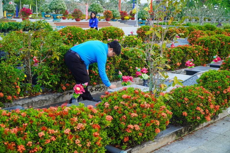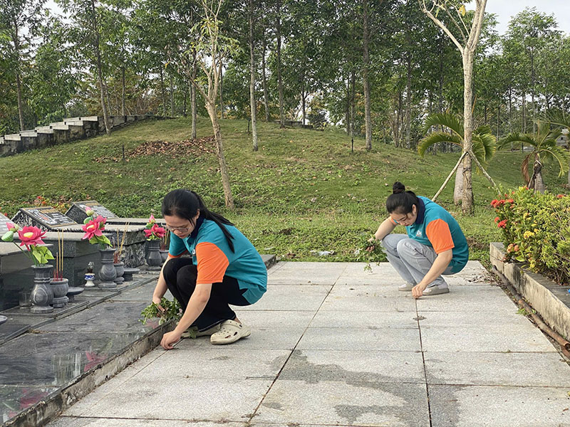 Đoàn viên thanh niên UEH Mekong tham gia dọn dẹp vệ sinh tại Nghĩa trang liệt sĩ tỉnh Vĩnh Long