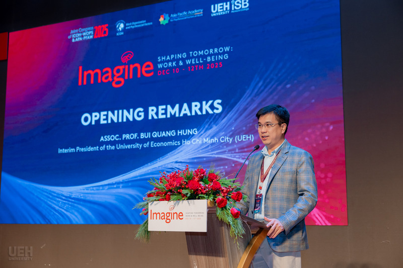 Ngày 10/12/2025, Trường Tài năng UEH.ISB, thuộc Đại học Kinh tế Thành phố Hồ Chí Minh (UEH) đã tổ chức lễ khai mạc Hội thảo quốc tế The 2nd Joint Congress of ICOH-WOPS & APA-PFAW 2025 với chủ đề “IMAGINE! Shaping Tomorrow: Work and Well-Being”. Sự kiện quy tụ hơn 300 đại biểu quốc tế từ 6 châu lục, trở thành diễn đàn thảo luận đa chiều về giải pháp cho những thách thức lớn của môi trường làm việc hiện đại.