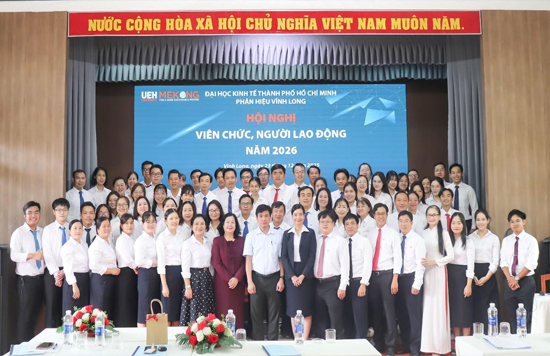 Ngày 23/12/2025, tại hội trường A3.1, UEH Mekong đã long trọng tổ chức Hội nghị viên chức, người lao động năm 2025, nhằm tổng kết, đánh giá kết quả thực hiện Nghị quyết Hội nghị viên chức, người lao động năm 2025, đồng thời đề ra phương hướng, mục tiêu và nhiệm vụ trọng tâm cho năm 2026.