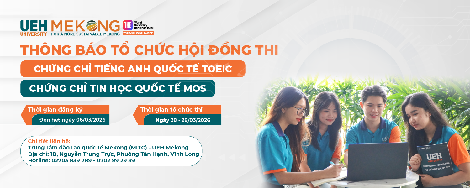 Thông tin chi tiết liên hệ: Trung tâm đào tạo quốc tế Mekong (MITC) - UEH Mekong Địa chỉ: 01B, Nguyễn Trung Trực, Phường Tân Hạnh, tỉnh Vĩnh Long Điện thoại: 0270 38 39 789 - Hotline/Zalo: 0702 99 29 39 (Ms. Thanh Hà) |