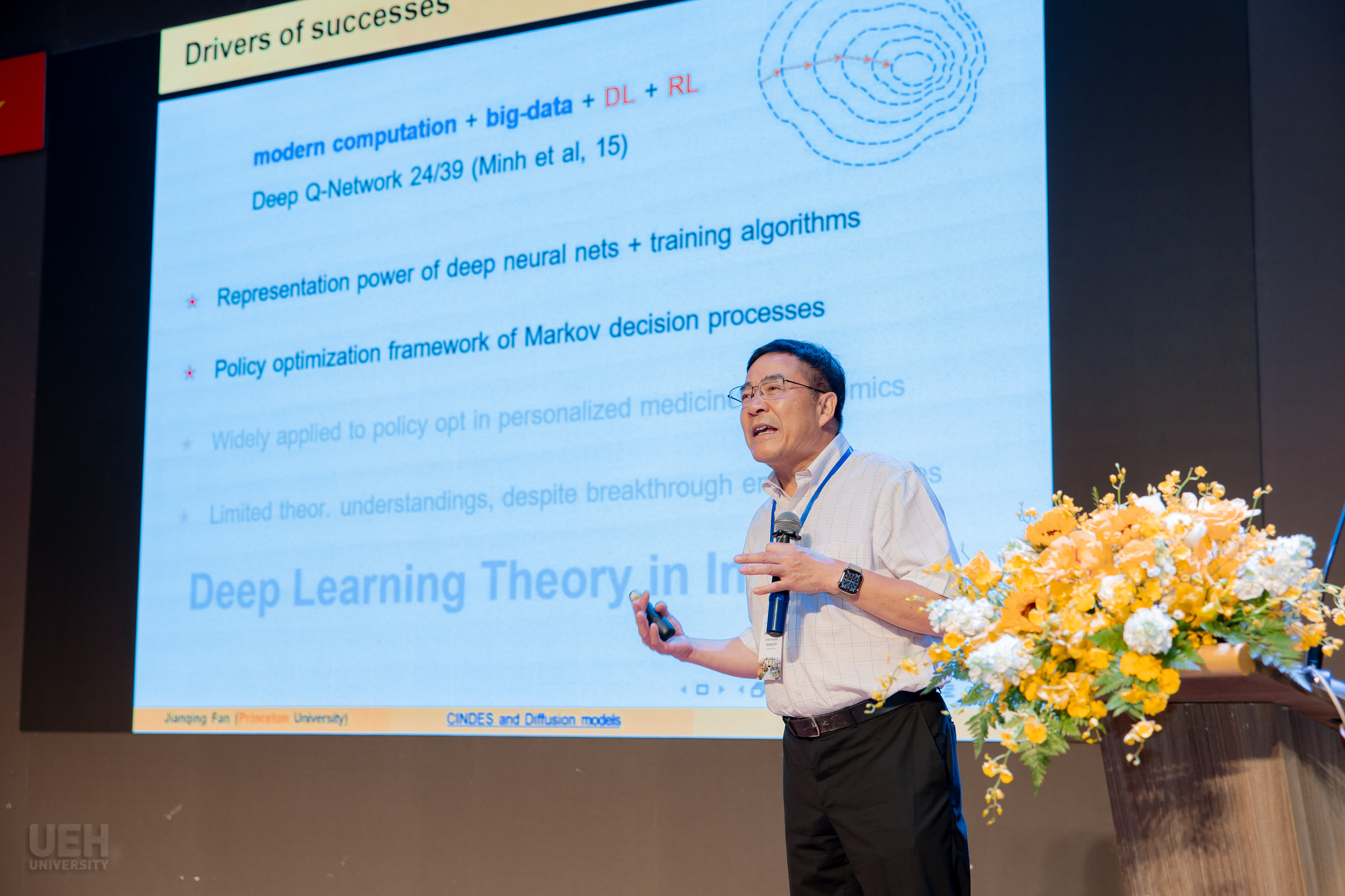 Là một trong ba diễn giả chính tại hội thảo năm nay, GS Jianqing Fan, Đại học Princeton – Mỹ mang đến bài trình bày ấn tượng về AI tạo sinh – loại trí tuệ nhân tạo có khả năng tạo ra nội dung mới. Theo ông, đứng sau làn sóng AI tạo sinh hiện nay là cả một bộ máy toán học tinh vi tạo nên. Bài trình bày mang tính học thuật cao, được những người tham dự hội thảo là hàng trăm chuyên gia đầu ngành toán, thống kê chăm chú theo dõi và tán thưởng.