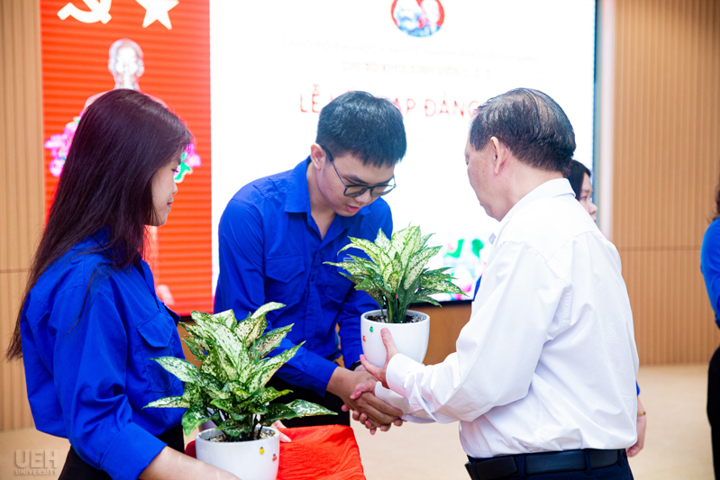 Các đồng chí Đảng viên mới nhận quà chúc mừng từ Đảng ủy UEH, Ban Thường vụ Đoàn UEH, Các chi bộ Khối Sinh viên