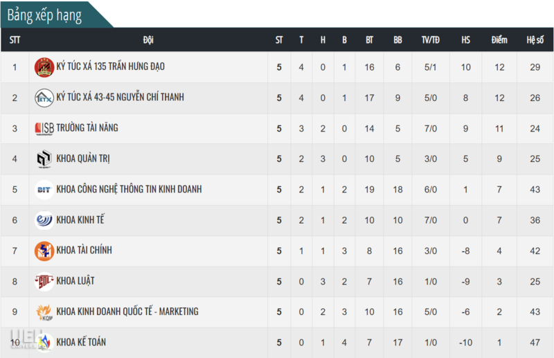 Thứ tự bảng xếp hạng của 10 đội sau khi vòng 5 kết thúc