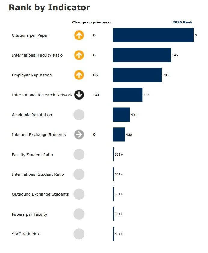 - Danh tiếng học thuật (Academic Reputation): tiếp tục ổn định trong nhóm 401+, nhờ hiệu ứng lan tỏa cộng hưởng từ thành tích xếp hạng toàn cầu (Top 136 THE Asia 2025; Top 501–600 THE WUR 2026), các dự án hợp tác học thuật và liên kết đào tạo quốc tế.
