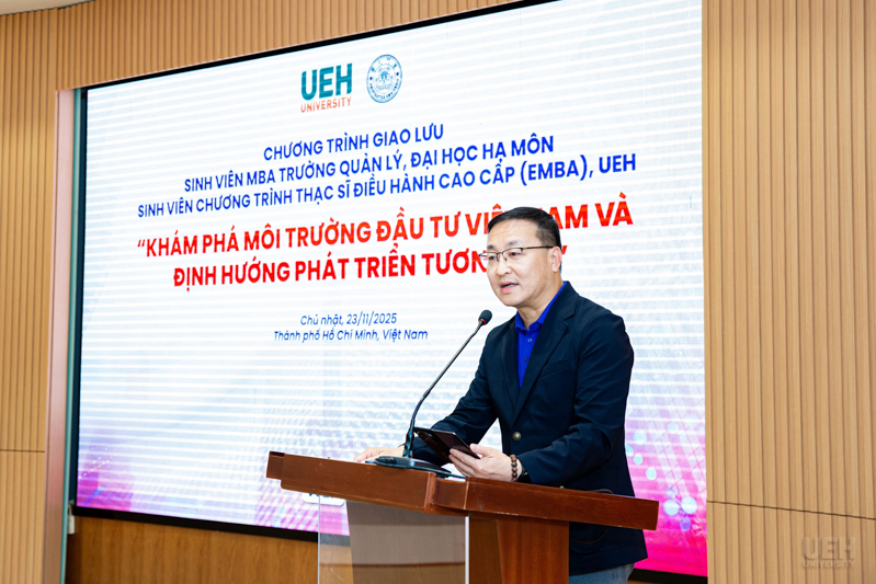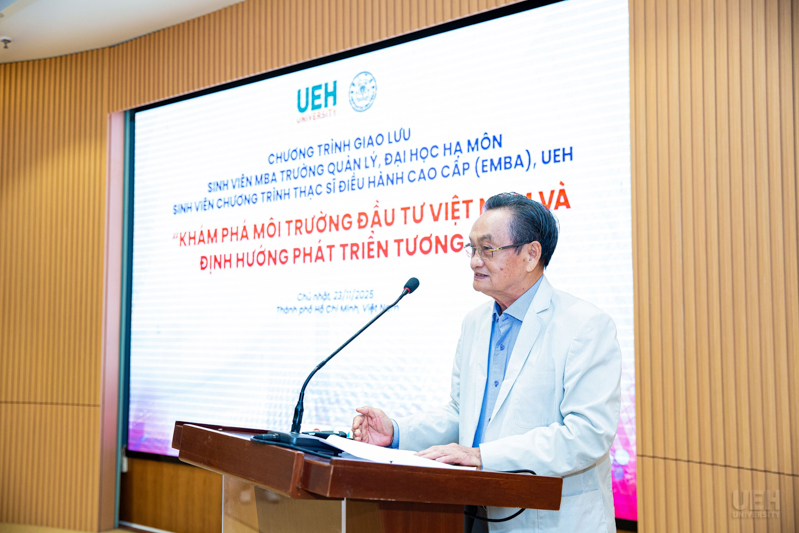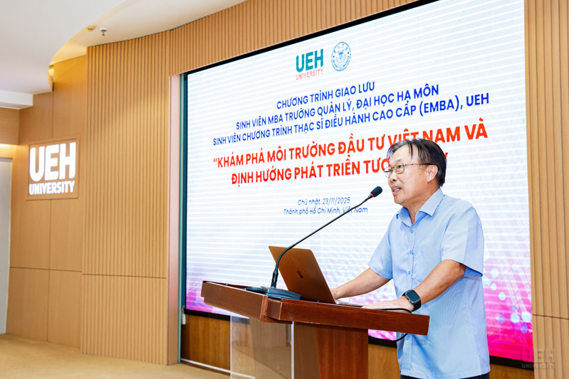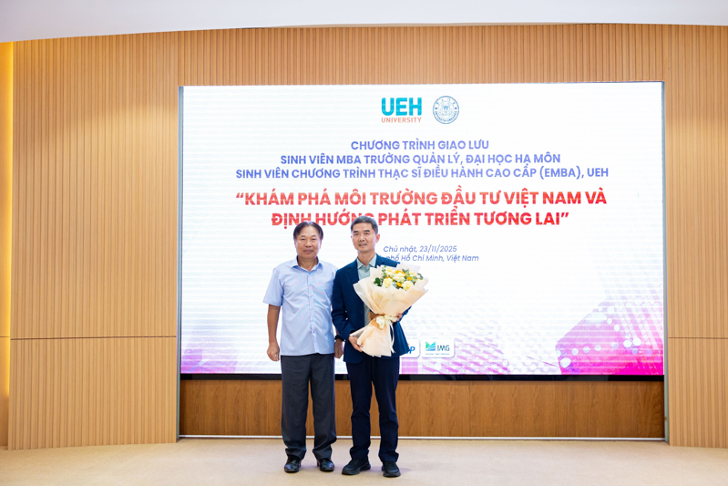 Ngày 23/11/2025 tại cơ sở A, Đại học Kinh tế Thành phố Hồ Chí Minh (UEH) đã tổ chức Chương trình giao lưu quốc tế giữa học viên MBA của Trường Quản lý, Đại học Hạ Môn (XMU) và học viên chương trình Thạc sĩ Điều hành cao cấp (EMBA) của UEH với chủ đề “Khám phá môi trường Đầu tư Việt Nam và Định hướng Phát triển Tương lai”. Sự kiện là diễn đàn trao đổi học thuật và chuyên môn giữa các chuyên gia kinh tế về môi trường kinh doanh và kinh nghiệm đầu tư tại Việt Nam, đồng thời tạo không gian kết nối giữa học viên, doanh nhân hai trường, thúc đẩy giao lưu học thuật và nghề nghiệp.