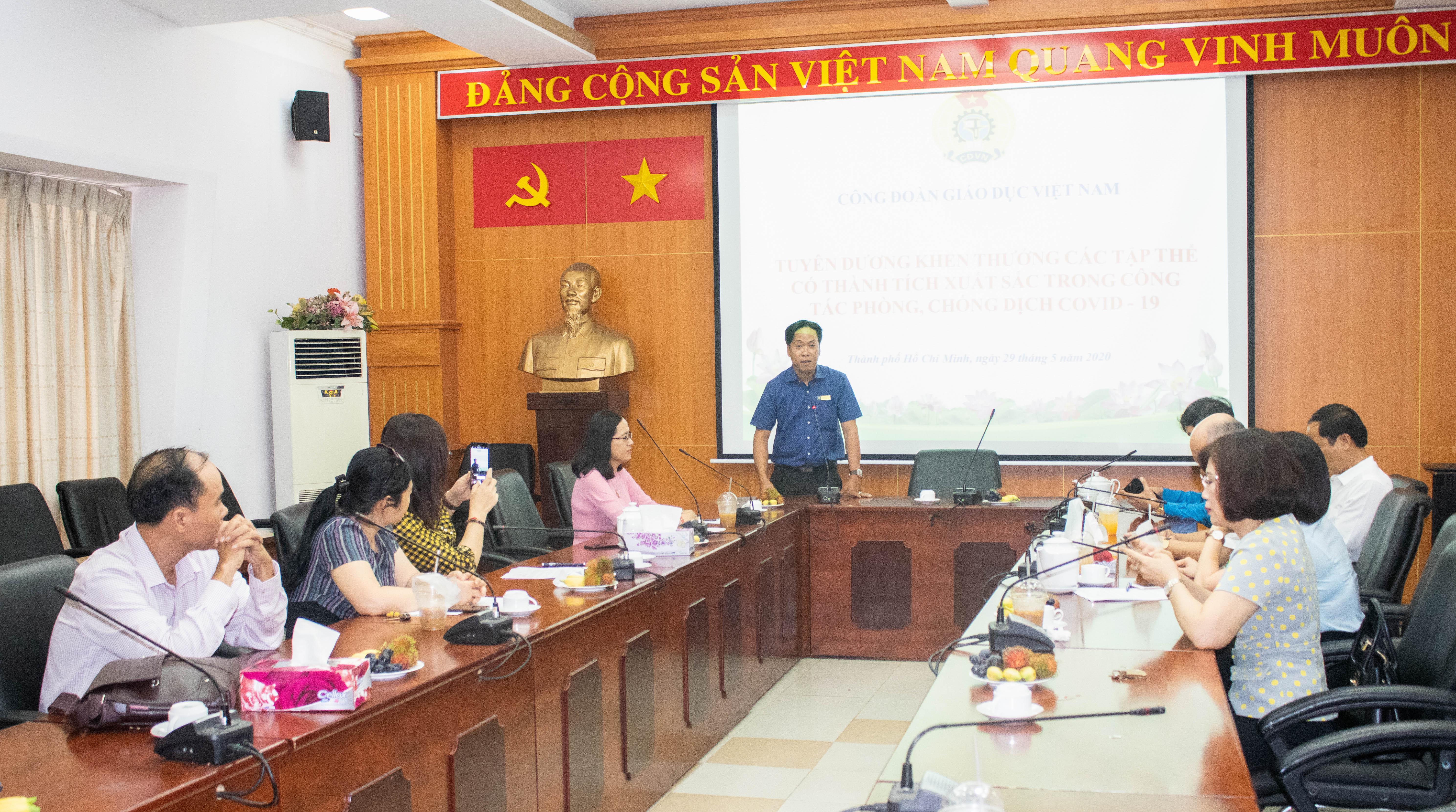 Sáng ngày 29/05/2020, tại Trung tâm phát triển Giáo dục và đào tạo phía Nam (số 3 Công trường Quốc tế, Q.3, TP.HCM), Công đoàn Giáo dục Việt Nam đã tổ chức lễ tuyên dương cho các đơn vị có thành tích xuất sắc trong công tác phòng chống dịch Covid - 19.