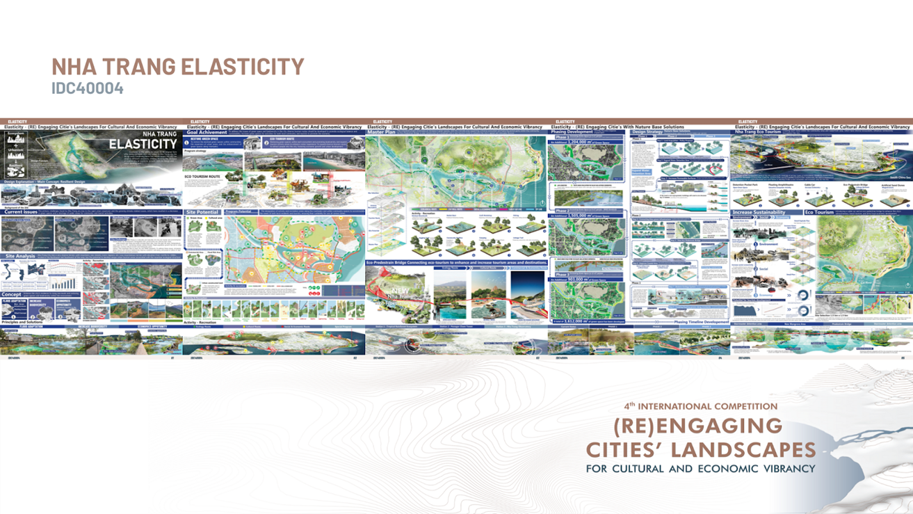 Ý tưởng của dự án đoạt giải quán quân - Nha Trang Elasticity - bắt nguồn từ việc giải quyết áp lực đô thị hóa và suy thoái môi trường. Dự án đặt mục tiêu để Nha Trang trở thành một đô thị đô thị bền vững và có khả năng thích ứng cao, thông qua việc tích hợp hạ tầng xanh, phục hồi hệ sinh thái và mô hình du lịch sinh thái dựa vào cộng đồng (community-based eco-tourism). Dự án xây dựng một bản kế hoạch chuyển đổi dài hạn với cốt lõi là các thiết kế tăng cường khả năng chống chịu và thích ứng của cảnh quan đô thị, tập trung tái kết nối các hệ sinh thái bị chia cắt, phục hồi vùng ngập và tăng cường đa dạng sinh học. Điểm nhấn của dự án là tuyến du lịch sinh thái (Eco-Tourism Route) - góp phần kích thích kinh tế địa phương, tạo điều kiện để lợi ích kinh tế được lan tỏa đến các cộng đồng và củng cố vị thế Nha Trang như một điểm đến với hệ sinh thái đặc trưng.