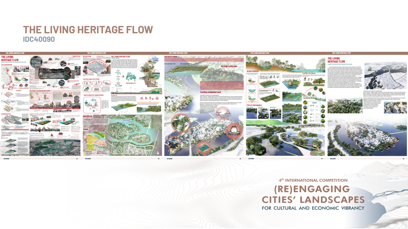 Dự án “The Living Heritage Flow” đưa ra tầm nhìn thiết kế tổng thể tái hiện hành lang sông Cái như không gian giao thoa giữa văn hóa, sinh thái và đô thị. Bằng cách đan xen dòng nước, chuyển động và gió, dự án kiến tạo khung phát triển bền vững, củng cố hệ sinh thái và duy trì bản sắc văn hóa. Điểm nhấn là hệ thống các công trình (tự nhiên hoặc nhân tạo) được thiết kế để giữ lại bùn cát, giảm xói lở và phục hồi hệ sinh thái ven sông, vừa tạo sinh cảnh đa dạng, vừa làm không gian cộng đồng, kết hợp bờ kè xanh chống xói mòn và làm mềm ranh giới đô thị.