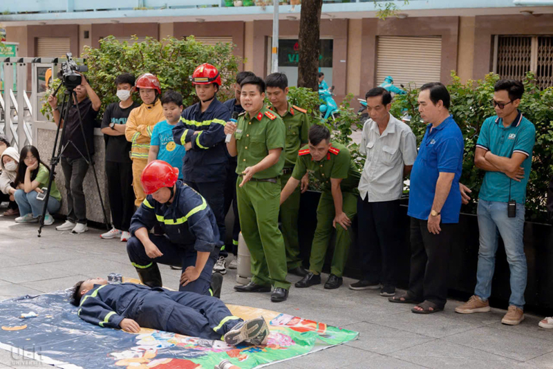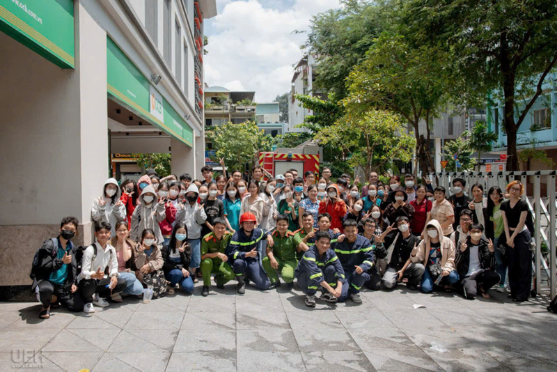 - Phối hợp với các cơ quan PCCC: UEH thường xuyên làm việc với Cảnh sát PCCC để cập nhật các quy định mới, học hỏi kinh nghiệm và tổ chức các hoạt động, các buổi diễn tập quy mô lớn, giúp nâng cao khả năng phối hợp và xử lý tình huống khẩn cấp cho cán bộ, giảng viên và sinh viên.