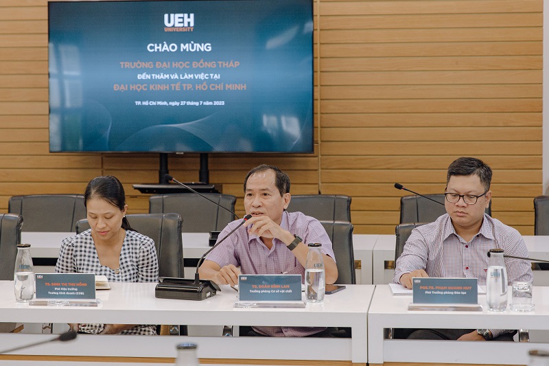 Thay mặt Ban lãnh đạo UEH, GS.TS. Sử Đình Thành - Hiệu trưởng Nhà trường đã bày tỏ sự vui mừng chào đón đoàn đại biểu Trường Đại học Đồng Tháp đến thăm và làm việc: “Gần 48 năm hình thành và phát triển, UEH đã khẳng định thương hiệu là một trường đại học công lập có uy tín hàng đầu tại Việt Nam, từng bước ghi dấu ấn trên thị trường thế giới. Từ năm 2021, UEH đã chính thức thực hiện chiến lược tái cấu trúc hình thành Đại học Đa ngành và Bền vững, ra mắt 3 trường thành viên gồm: Trường Kinh doanh UEH; Trường Kinh tế, Luật và Quản lý nhà nước UEH; Trường Công nghệ và Thiết kế UEH. Không chỉ là nơi cung cấp cho người học các chương trình đào tạo chất lượng cao về khoa học kinh tế, kinh doanh, quản lý, luật, công nghệ và thiết kế; UEH còn chuyển giao những kết quả nghiên cứu khoa học vào thực tiễn, góp phần phát triển nguồn nhân lực chất lượng cao phục vụ cho công cuộc công nghiệp hóa, hiện đại hóa đất nước trong bối cảnh hội nhập kinh tế toàn cầu. Trên hành trình phát triển ấy, UEH luôn chú trọng tăng cường mở rộng quan hệ với các đối tác trong và ngoài nước, đặc biệt là các trường đại học uy tín và chất lượng trên tinh thần “Kết nối cộng đồng - Lan tỏa tri thức - Hành động bền vững” để mang lại những giá trị thiết thực cho người học và xã hội. Chính vì vậy, Ban lãnh đạo UEH rất vui mừng khi Trường Đại học Đồng Tháp đến thăm và làm việc tại Trường ngày hôm nay.”