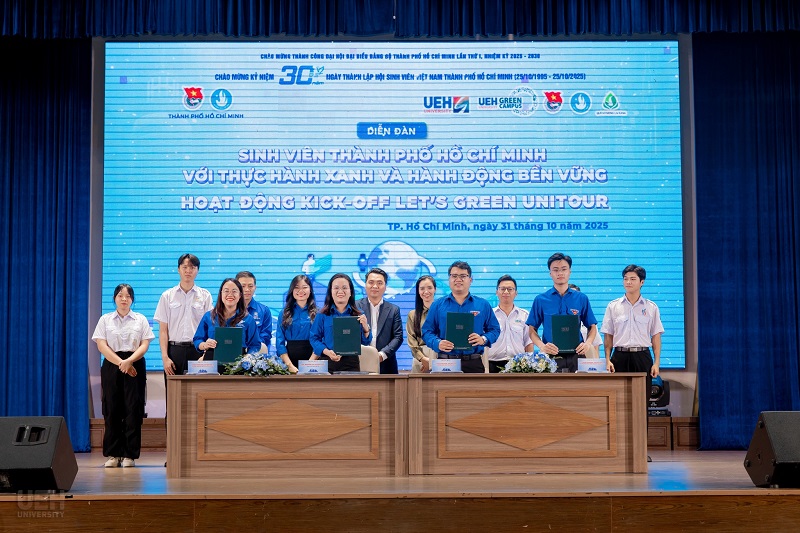 Đặc biệt, năm 2025 ghi dấu ấn rõ nét vai trò tiên phong của Đoàn - Hội UEH trong lan tỏa mô hình Đại học xanh. Các hoạt động trong khuôn khổ Đề án UEH Green Campus được triển khai mạnh mẽ với sự tham gia của hàng chục nghìn sinh viên thông qua chiến dịch “Tình nguyện viên xanh”, các workshop tái chế, talkshow về kinh tế tuần hoàn và phát triển bền vững. Hưởng ứng Tuần lễ Sinh viên Thành phố tiên phong phát triển khoa học, công nghệ, đổi mới sáng tạo và chuyển đổi số, Đoàn - Hội UEH phối hợp cùng Quỹ Vì tương lai xanh - VinGroup tổ chức Diễn đàn “Sinh viên TP. Hồ Chí Minh với thực hành xanh và hành động bền vững”, đồng thời khởi động và chuyển giao mô hình Let’s Green Unitour đến 10 cơ sở giáo dục đại học, cao đẳng, qua đó lan tỏa thực hành xanh từ UEH ra cộng đồng.