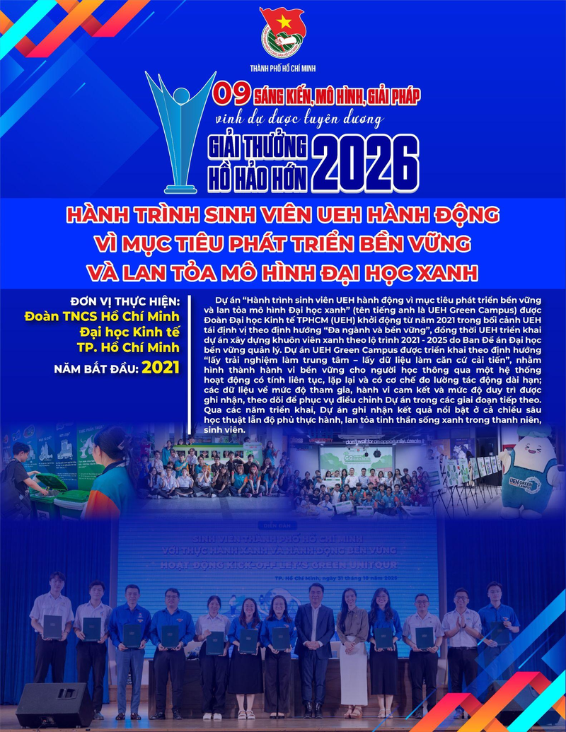 Dự án “Hành trình sinh viên UEH vì mục tiêu phát triển bền vững và lan tỏa mô hình Đại học xanh” là 01 trong 09 tập thể tiêu biểu được trao Giải thưởng Hồ Hảo Hớn năm 2026