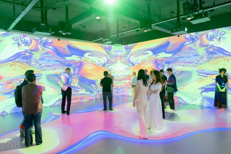 Người tham dự tham quan và trải nghiệm Không gian học tập đắm chìm - Immersive Room (Phòng B2.110) tại UEH