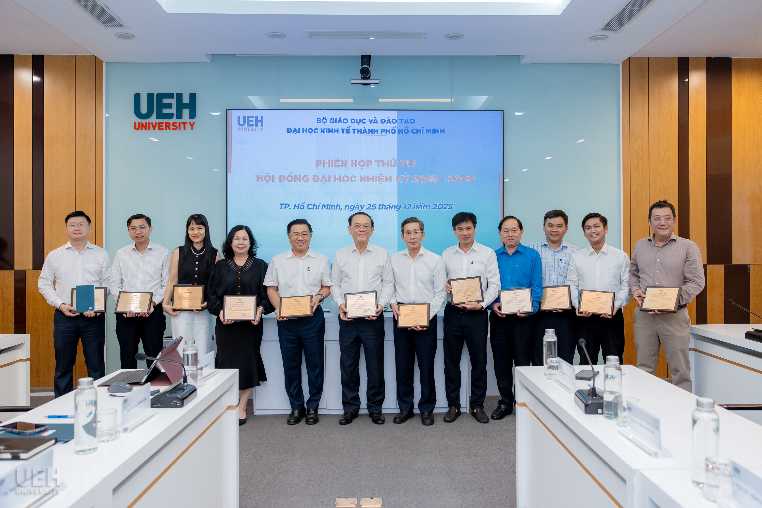 Chiều ngày 25/12/2025, tại phòng A205, Hội đồng đại học Đại học Kinh tế Thành phố Hồ Chí Minh (UEH) nhiệm kỳ 2025-2030 tổ chức Phiên họp thứ Tư theo chương trình làm việc đã được thông qua, đánh dấu giai đoạn hoàn tất các nội dung trọng tâm trong nhiệm kỳ 2025-2030 của Hội đồng đại học.
