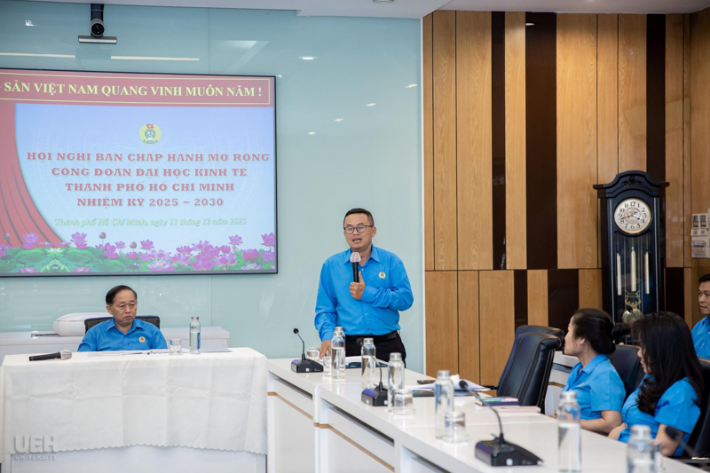 Chiều ngày 11/12/2025, Công đoàn cơ sở Đại học Kinh tế Thành phố Hồ Chí Minh (UEH) đã tổ chức trọng thể Hội nghị Ban Chấp hành mở rộng, nhiệm kỳ 2025 - 2030. Hội nghị nhằm tổng kết hoạt động giai đoạn 2023 - 2025, định hướng chiến lược cho giai đoạn mới, đồng thời công bố quyết định kéo dài nhiệm kỳ Ban Chấp hành đến năm 2030.