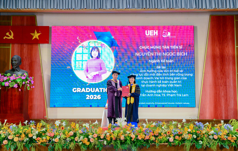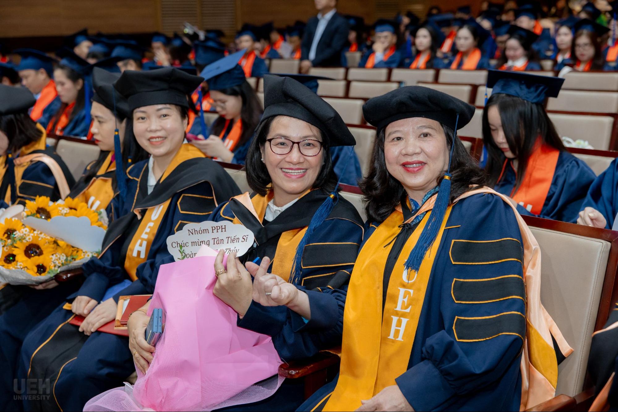 Các Tân Tiến sĩ, Thạc sĩ UEH đã xuất sắc thể hiện năng lực chuyên môn, mở rộng phạm vi nghiên cứu theo hướng liên ngành trong khoa học kinh tế, chủ động ứng dụng công nghệ mới và không ngừng nâng cao trình độ ngoại ngữ phục vụ nghiên cứu, trao đổi học thuật và công bố quốc tế. Đặc biệt, ở bậc Tiến sĩ, năng lực hội nhập quốc tế được khẳng định thông qua 15 bài báo công bố trên các tạp chí uy tín thuộc danh mục Scopus và WoS; đồng thời có 8/17 luận án được viết và bảo vệ hoàn toàn bằng tiếng Anh.