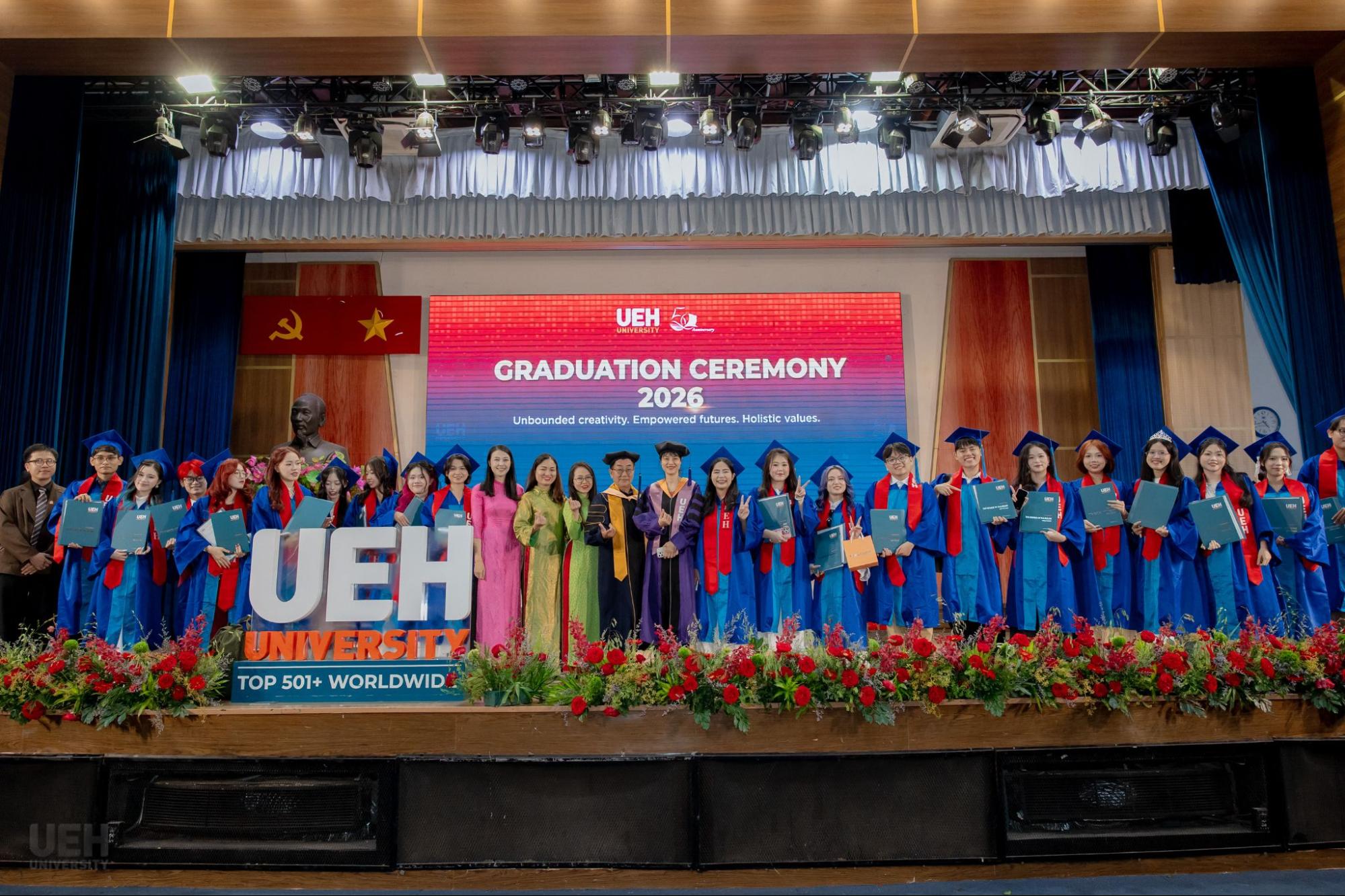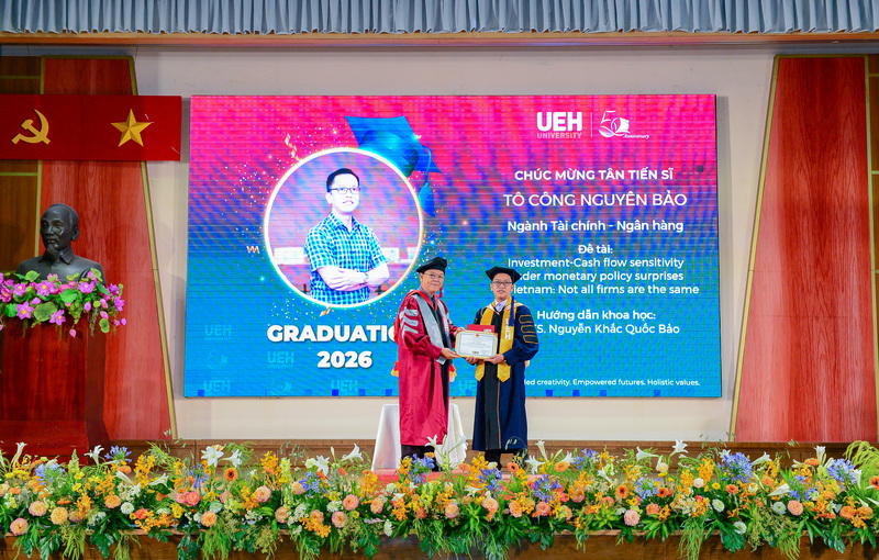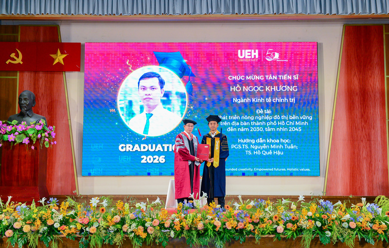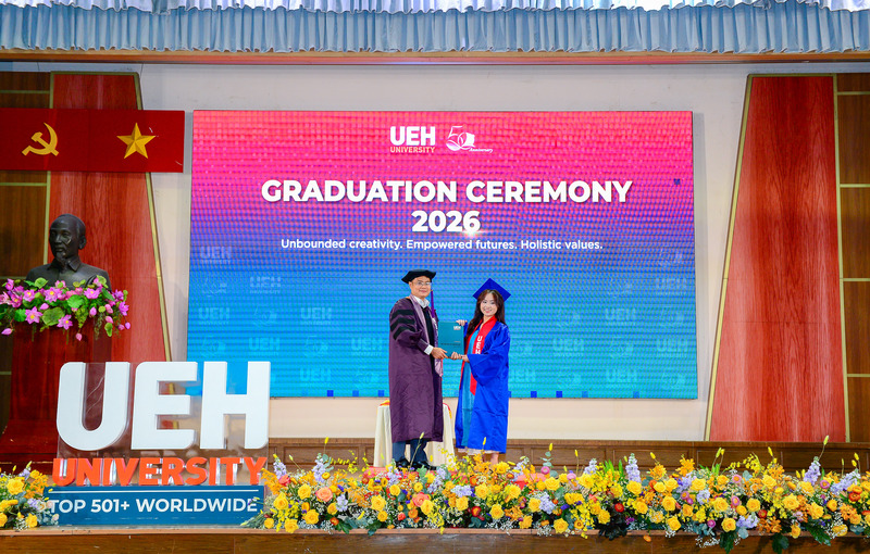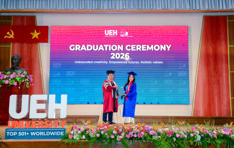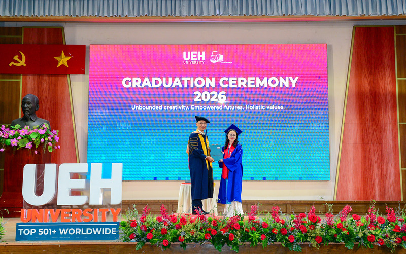 Đại học Kinh tế Thành phố Hồ Chí Minh chúc mừng các Tân Tiến sĩ, Thạc sĩ, Cử nhân chính thức tốt nghiệp! Đây là cột mốc khép lại hành trình học tập và rèn luyện đầy nỗ lực của các bạn, đồng thời cũng mở ra những chân trời mới, cơ hội mới để tiếp tục nghiên cứu, cống hiến và phụng sự tri thức cho xã hội, cộng đồng. Với nền tảng chuyên môn được bồi đắp tại mái trường UEH, các Tân Tiến sĩ, Thạc sĩ và Cử nhân tại UEH sẵn sàng đặt chân vào thị trường lao động, bước ra thế giới, sẵn sàng dấn thân hội nhập toàn cầu./.