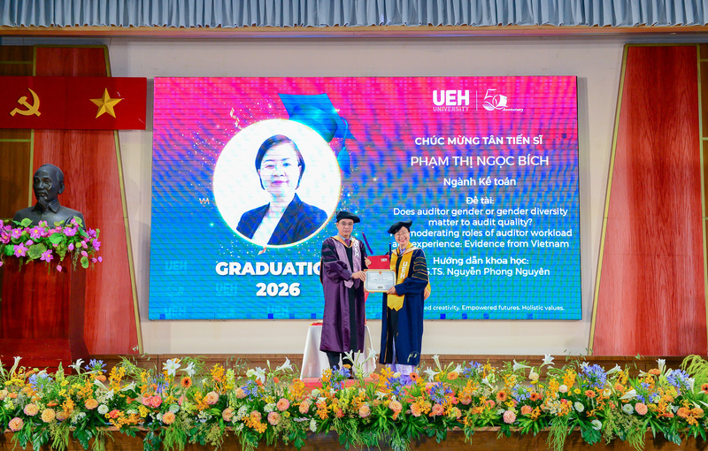 Lễ tốt nghiệp đợt 1 năm 2026 của UEH có 6.303 người học chính thức tốt nghiệp. Trong đó, có 17 Tân Tiến sĩ, 390 Tân Thạc sĩ, 5.438 Tân Cử nhân hệ ĐHCQ của TP.HCM và UEH Mekong, 458 sinh viên hệ Vừa làm vừa học (VLVH). Đến từ các Chương trình đào tạo gồm: