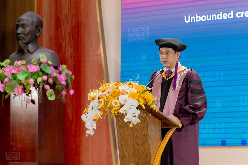 Phát biểu chúc mừng các Tân Tiến sĩ, Thạc sĩ và Tân cử nhân, PGS.TS. Bùi Quang Hùng - Phó Giám đốc phụ trách UEH chia sẻ: “Trải qua nửa thế kỷ xây dựng và phát triển, UEH đã từng bước khẳng định vị thế là một đại học đa ngành, định hướng nghiên cứu và hành động bền vững; vươn lên trở thành một trong những cơ sở giáo dục hàng đầu khu vực, từng bước hội nhập sâu rộng vào hệ thống học thuật toàn cầu với nhiều thành tựu nổi bật. Những thành tựu đó không chỉ là niềm tự hào của nhà trường mà còn là nền tảng để các thế hệ sinh viên, trong đó có các em hôm nay, tự tin bước ra thế giới. Bước vào chặng đường phía trước, các em cần tiếp tục gìn giữ những giá trị cốt lõi: trung thực, trách nhiệm và tinh thần phụng sự cộng đồng. Hãy luôn nhớ rằng giá trị của thành công không chỉ nằm ở những gì chúng ta đạt được, mà còn ở những đóng góp tích cực cho cộng đồng và xã hội. Thành công của các em sẽ tiếp tục lan tỏa giá trị và uy tín của nhà trường với tinh thần “Thỏa sức sáng tạo - Chủ động tương lai - Toàn diện giá trị”. UEH sẽ luôn là mái nhà để các em trở về, dẫu mai sau mỗi người đều có hành trình riêng”.