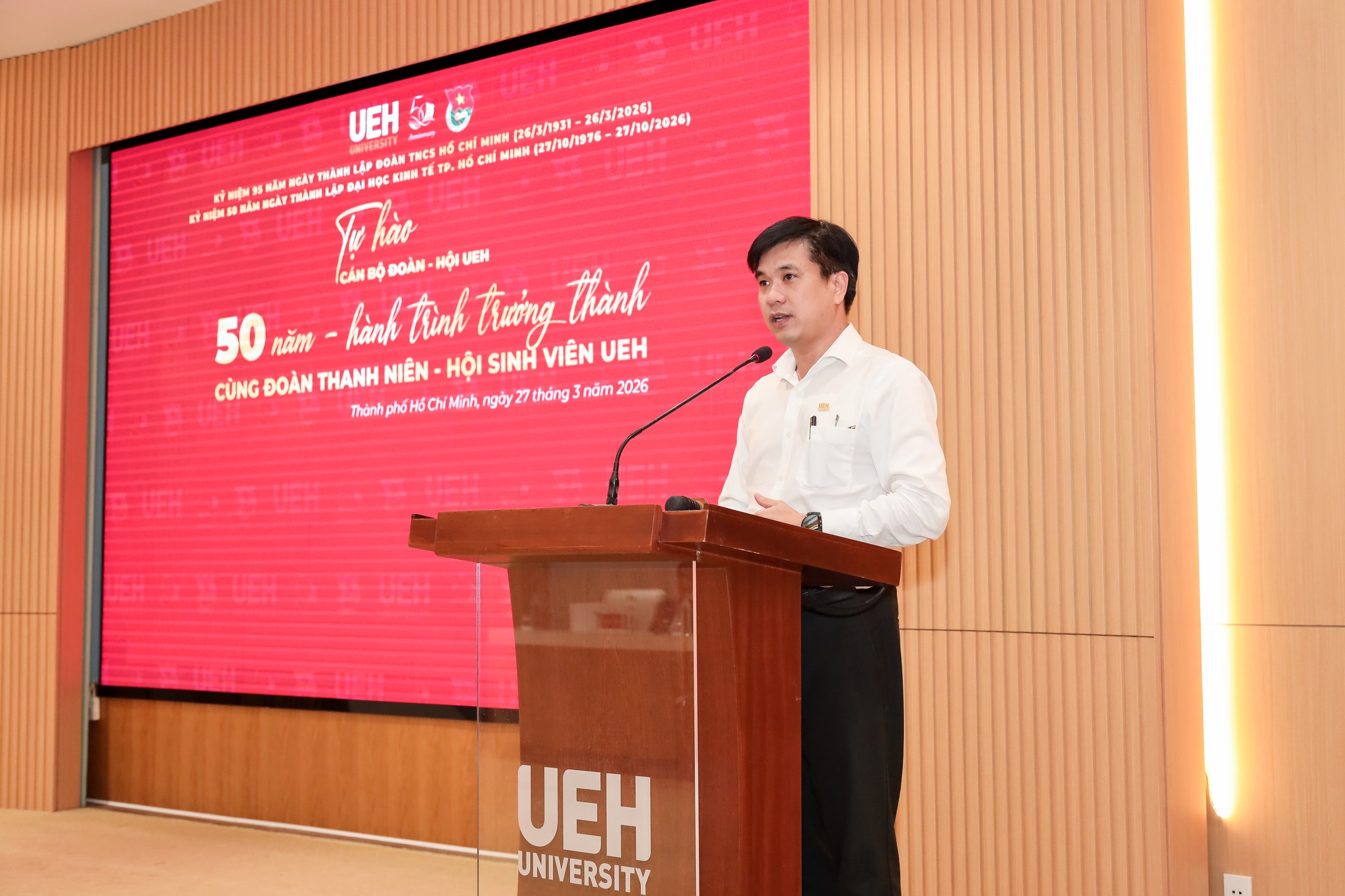 Mở đầu chương trình, PGS.TS. Bùi Quang Hùng đã phát biểu chúc mừng tập thể Đoàn Thanh niên UEH cùng các thế hệ cựu cán bộ Đoàn - Hội UEH nhân dịp kỷ niệm 95 năm ngày thành lập Đoàn TNCS Hồ Chí Minh, đồng thời nhấn mạnh niềm tự hào về hành trình 50 năm trưởng thành, phát triển của tuổi trẻ UEH cùng Đoàn Thanh niên - Hội Sinh viên UEH.