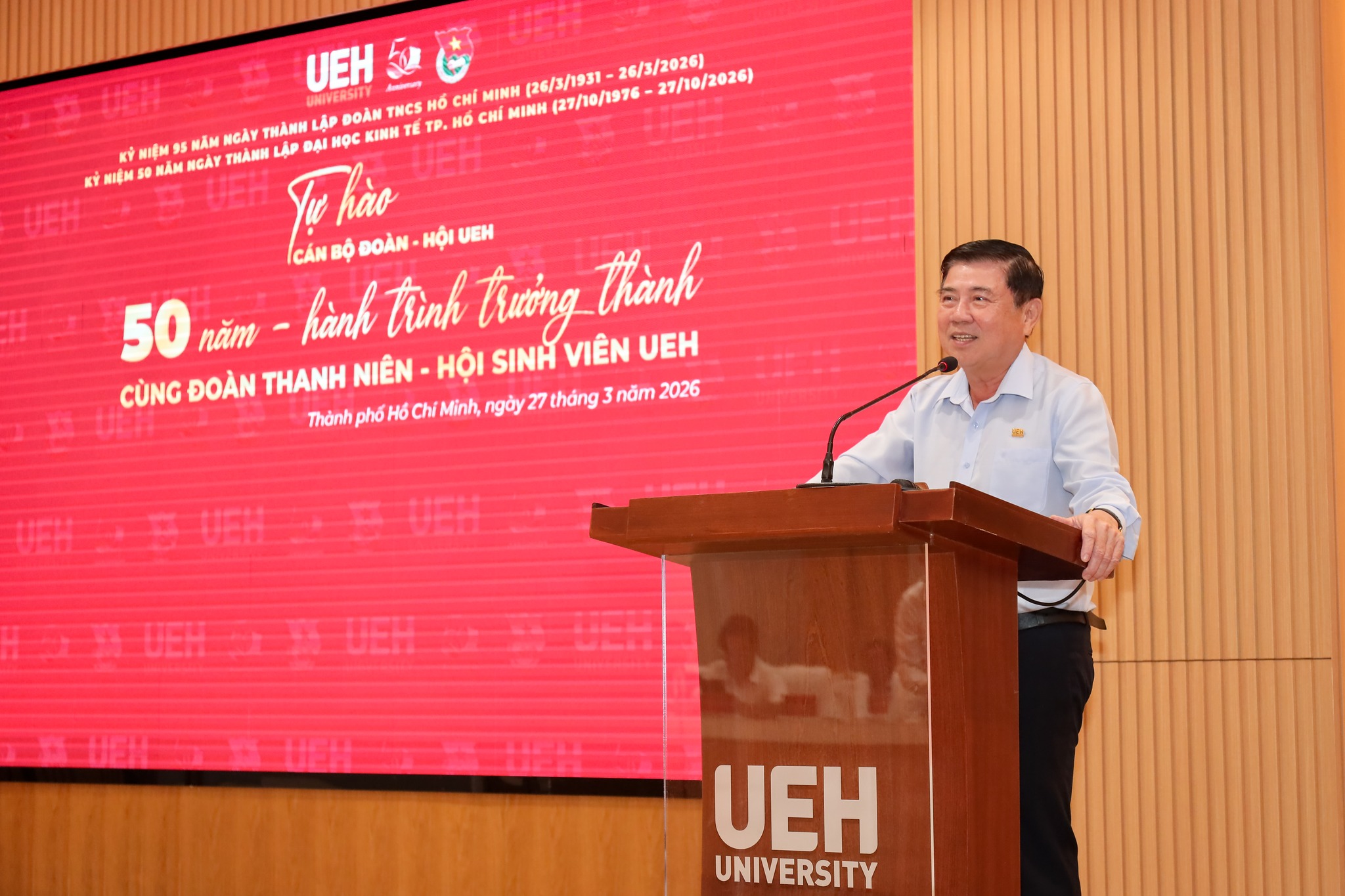 Chương trình vinh dự lắng nghe phát biểu của đồng chí Nguyễn Thành Phong, nhấn mạnh giá trị truyền thống của tổ chức Đoàn - Hội - môi trường rèn luyện, trưởng thành của bao thế hệ sinh viên UEH, cùng những kỳ vọng tuổi trẻ tiếp tục phát huy tinh thần tiên phong, đổi mới trong giai đoạn mới.