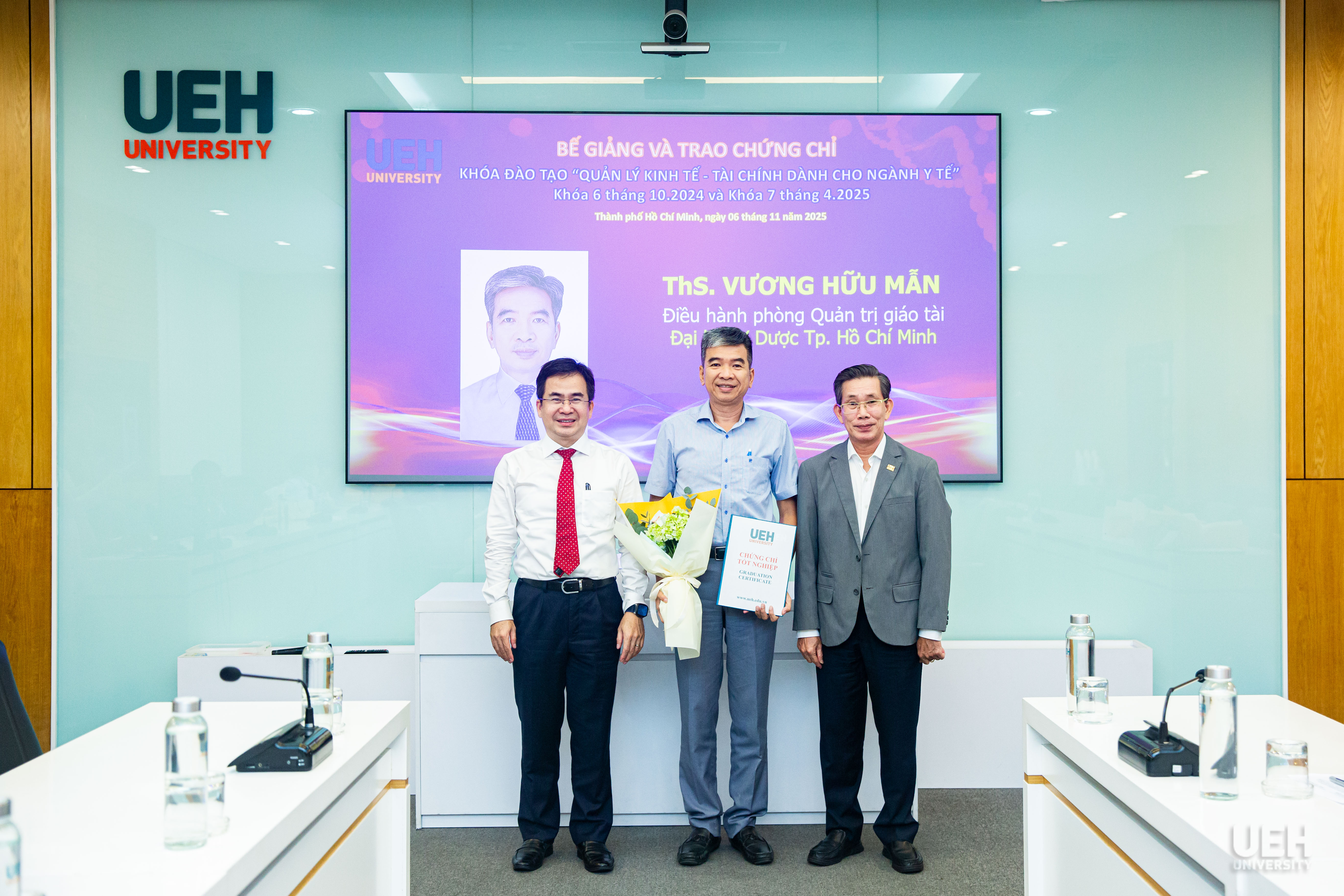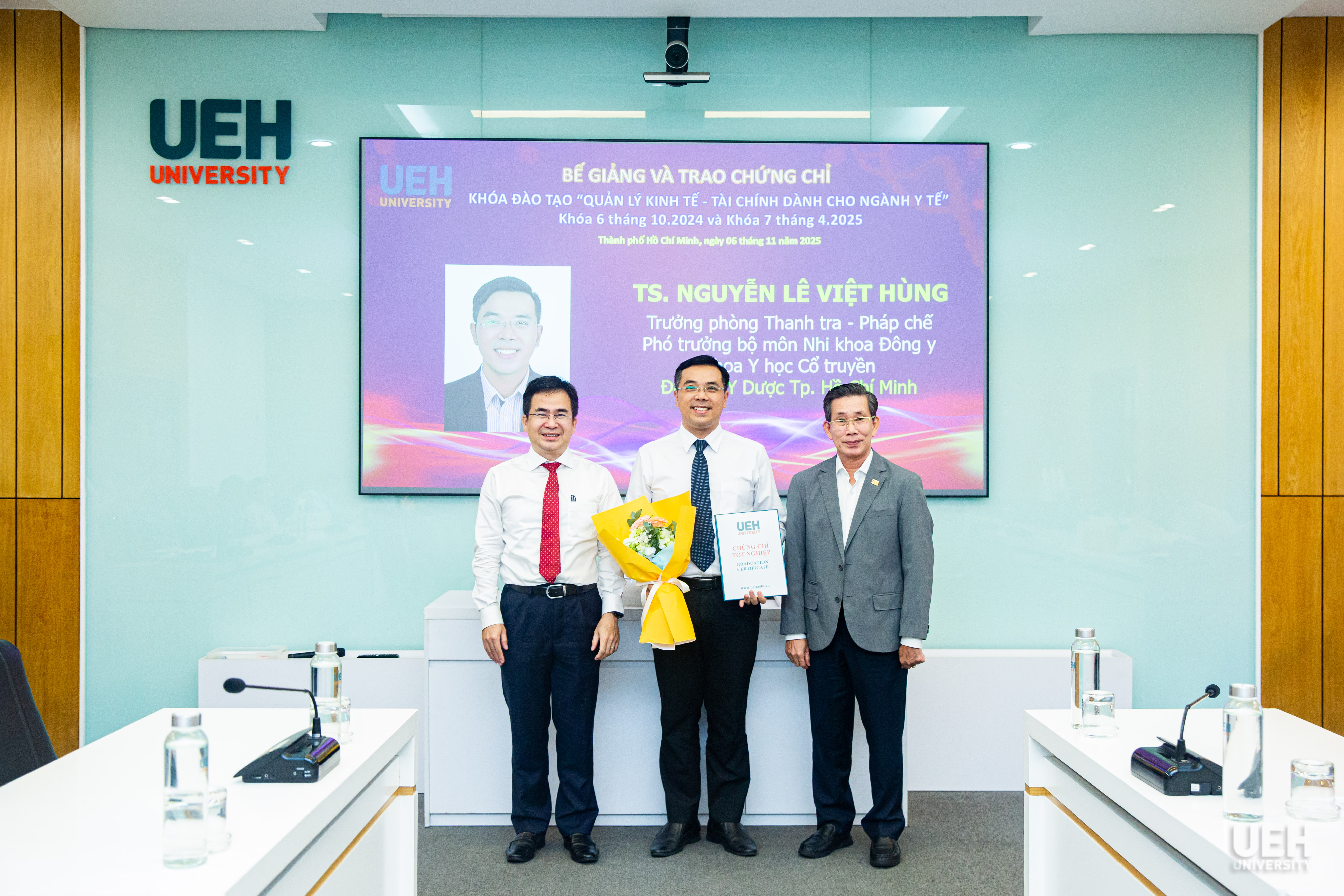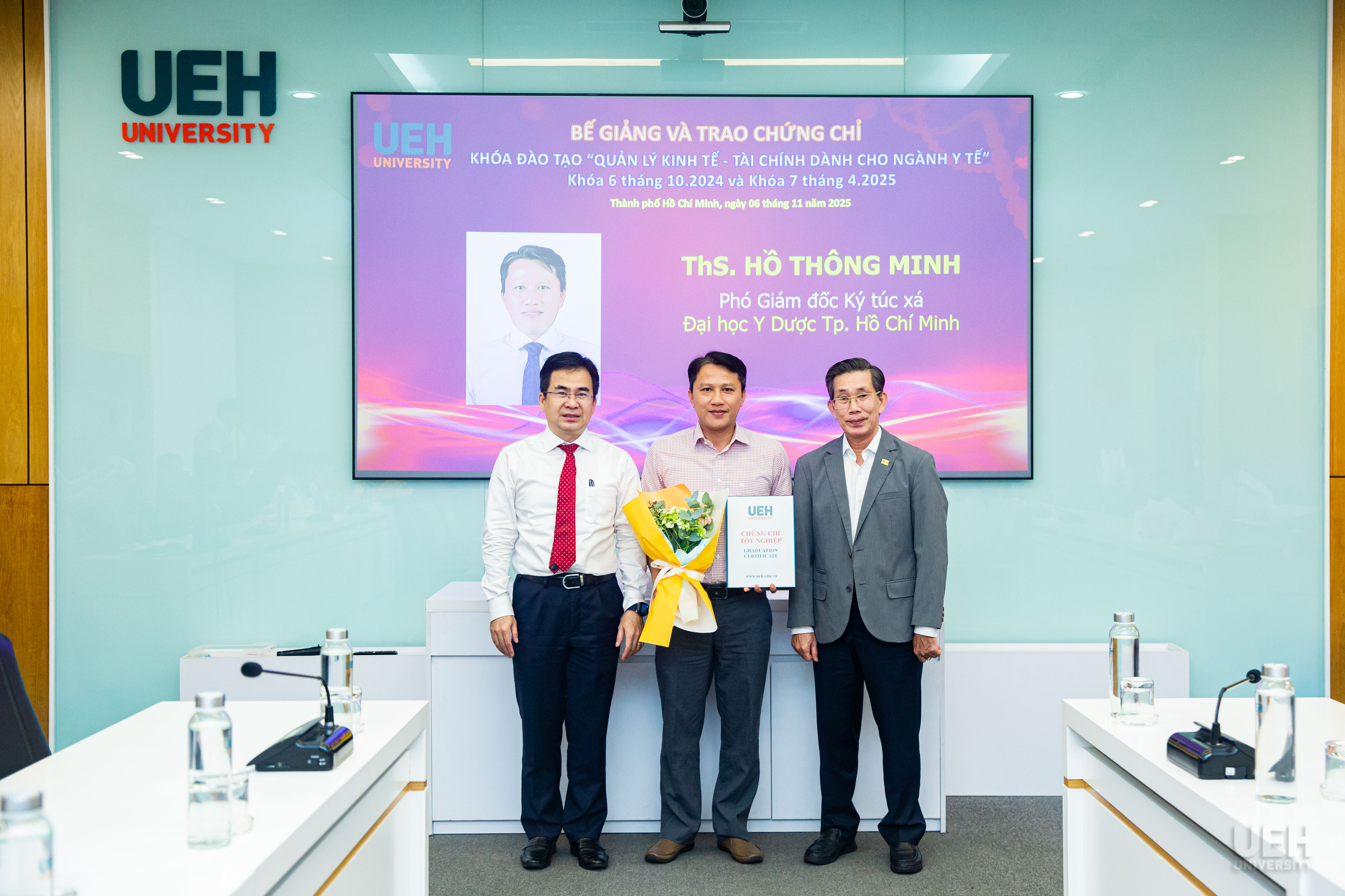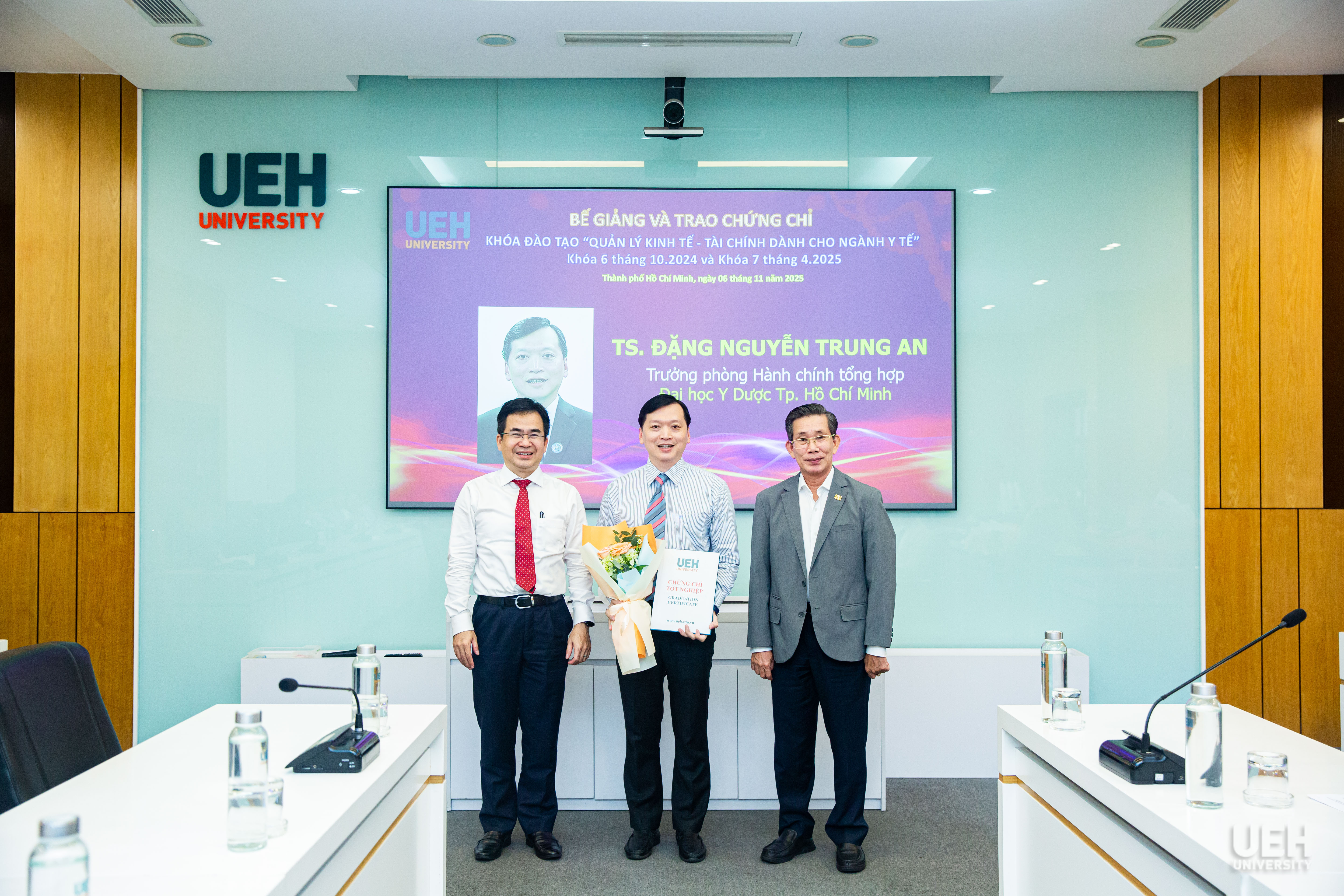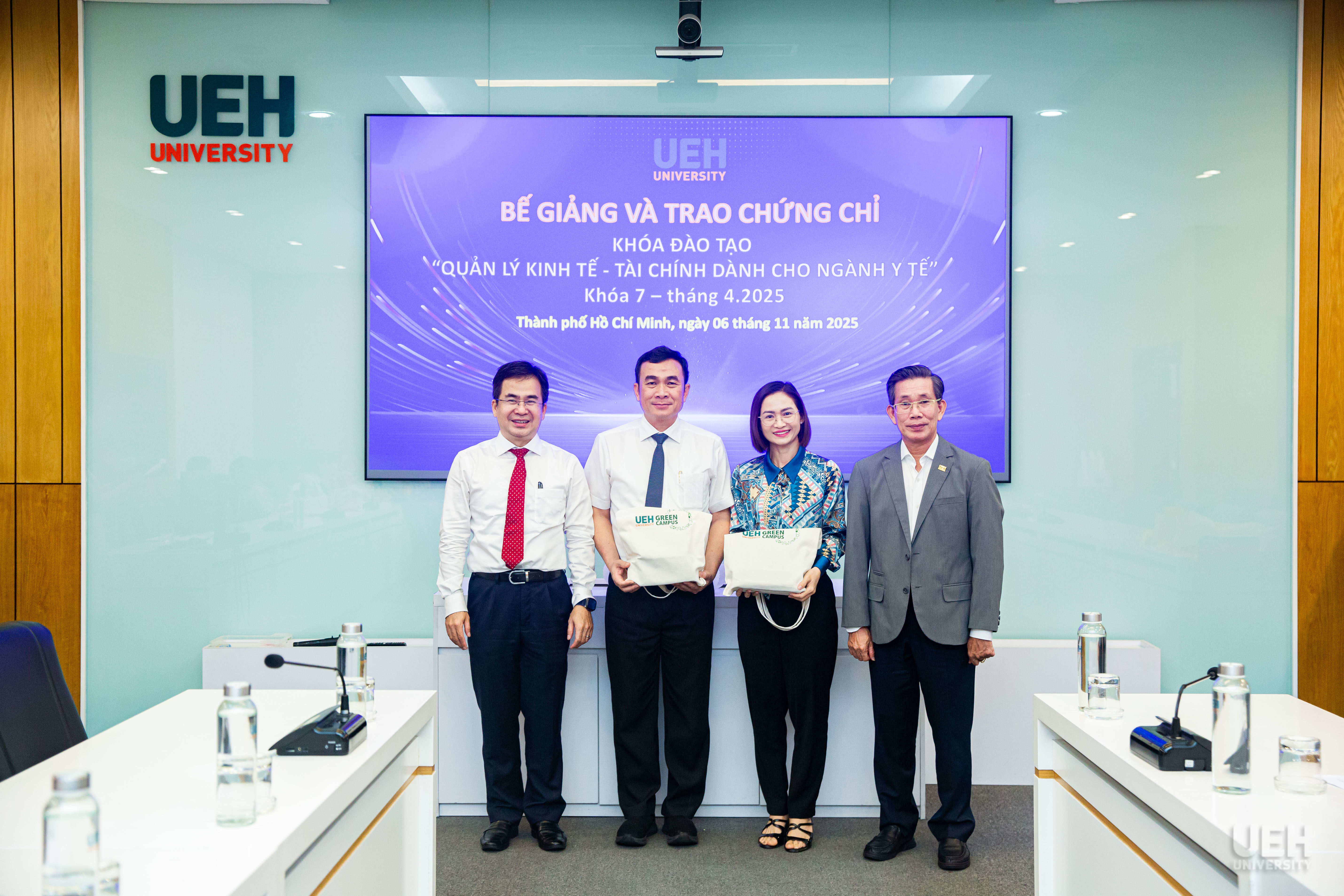 Sáng ngày 06/11/2025, tại phòng A205 – cơ sở 59C Nguyễn Đình Chiểu, Đại học Kinh tế Thành phố Hồ Chí Minh (UEH) đã long trọng tổ chức Lễ Bế giảng và trao chứng chỉ Khóa bồi dưỡng “Quản lý kinh tế - tài chính dành cho ngành Y tế” Khóa 7 - đợt tháng 4/2025.